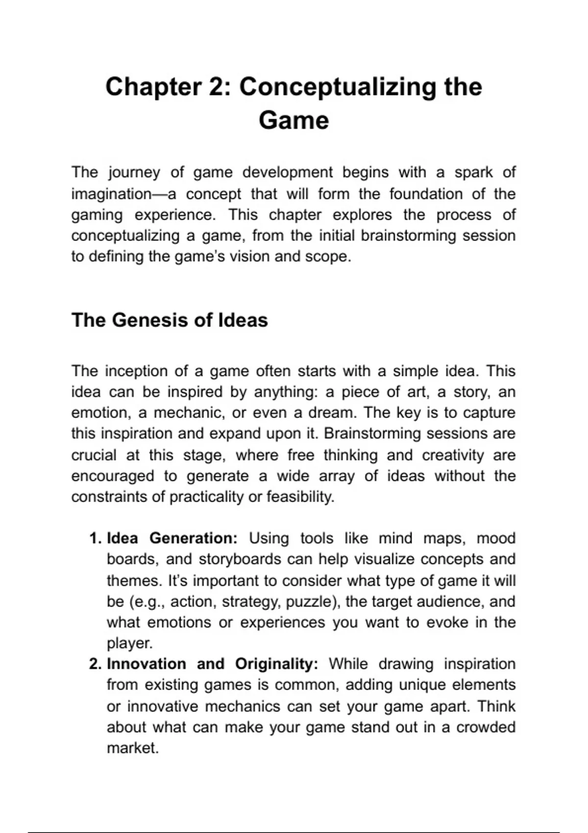 Description: The process of brainstorming and defining the game's vision and scope. Keywords: conceptualizing, brainstorming, game vision, scope Questions: How do you conceptualize a game?, What is involved in defining a game's scope?
