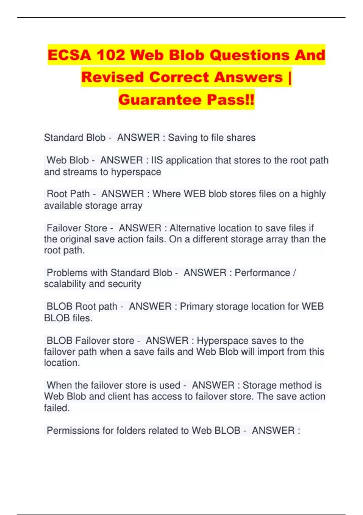 ECSA 102 Web Blob Questions And Revised Correct Answers | Guarantee Pass!! Standard Blob - ANSWER : Saving to file shares Web Blob - ANSWER : IIS application that stores to the root path and streams to hyperspace Root Path - ANSWER : Where WEB blob stores files on a highly available storage array Failover Store - ANSWER : Alternative location to save files if the original save action fails. On a different storage array than the root path. Problems with Standard Blob - ANSWER : Performance / scalability and security BLOB Root path - ANSWER : Primary storage location for WEB BLOB files. BLOB Failover store - ANSWER : Hyperspace saves to the failover path when a save fails and Web Blob will import from this location. When the failover store is used - ANSWER : Storage method is Web Blob and client has access to failover store. The save action failed.