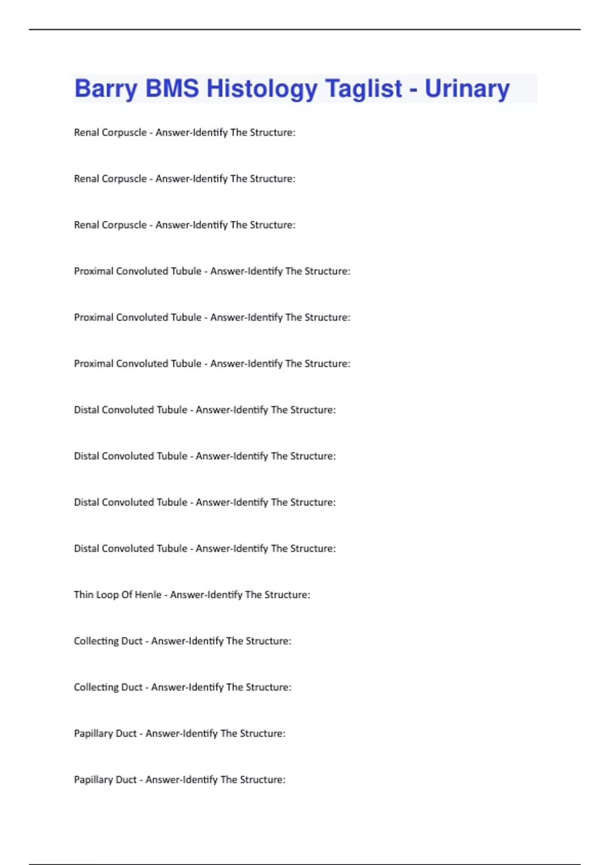 Barry BMS Histology Taglist - Urinary Questions With Correct Answers.