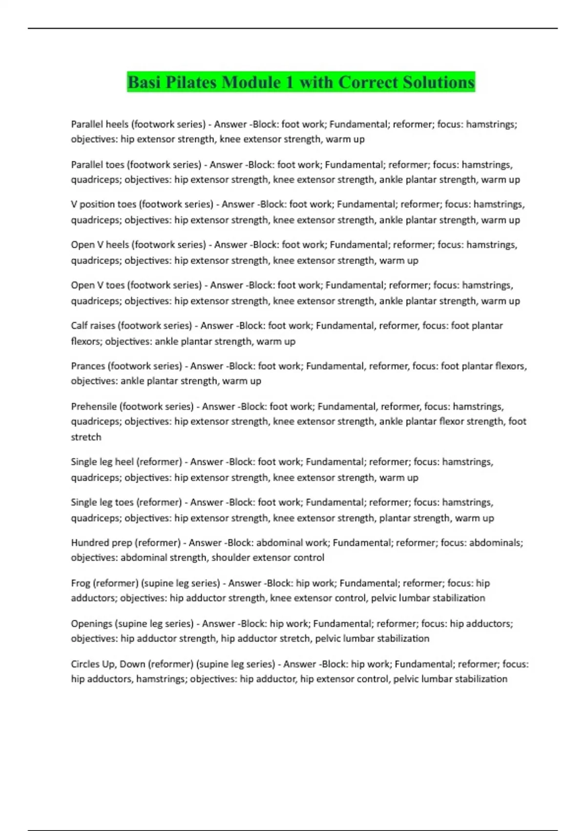 Basi Pilates Module 1 with Correct Solutions Parallel heels (footwork series) - Answer -Block: foot work; Fundamental; reformer; focus: hamstrings; objectives: hip extensor strength, knee extensor strength, warm up Parallel toes (footwork series) - Answer -Block: foot work; Fundamental; reformer; focus: hamstrings, quadriceps; objectives: hip extensor strength, knee extensor strength, ankle plantar strength, warm up V position toes (footwork series) - Answer -Block: foot work; Fundamental; reformer; focus: hamstrings, quadriceps; objectives: hip extensor strength, knee extensor strength, ankle plantar strength, warm up Open V heels (footwork series) - Answer -Block: foot work; Fundamental; reformer; focus: hamstrings, quadriceps; objectives: hip extensor strength, knee extensor strength, warm up Open V toes (footwork series) - Answer -Block: foot work; Fundamental; reformer; focus: hamstrings, quadriceps; objectives: hip extensor strength, knee extensor strength, ankle plantar strength, warm up Calf raises (footwork series) - Answer -Block: foot work; Fundamental, reformer, focus: foot plantar flexors; objectives: ankle plantar strength, warm up Prances (footwork series) - Answer -Block: foot work; Fundamental, reformer, focus: foot plantar flexors, objectives: ankle plantar strength, warm up