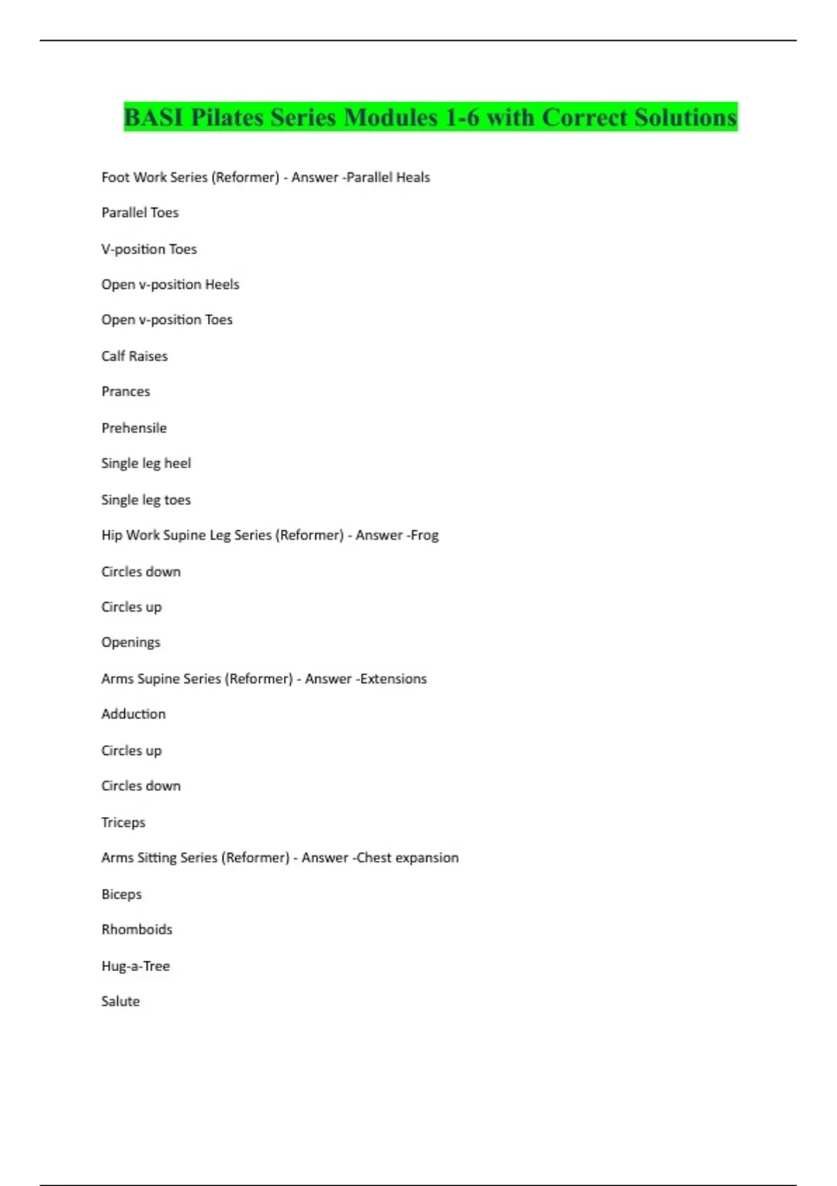 BASI Pilates Series Modules 1-6 with Correct Solutions Foot Work Series (Reformer) - Answer -Parallel Heals Parallel Toes V-position Toes Open v-position Heels Open v-position Toes Calf Raises Prances Prehensile Single leg heel Single leg toes Hip Work Supine Leg Series (Reformer) - Answer -Frog Circles down Circles up Openings Arms Supine Series (Reformer) - Answer -Extensions Adduction Circles up Circles down Triceps Arms Sitting Series (Reformer) - Answer -Chest expansion Bicep