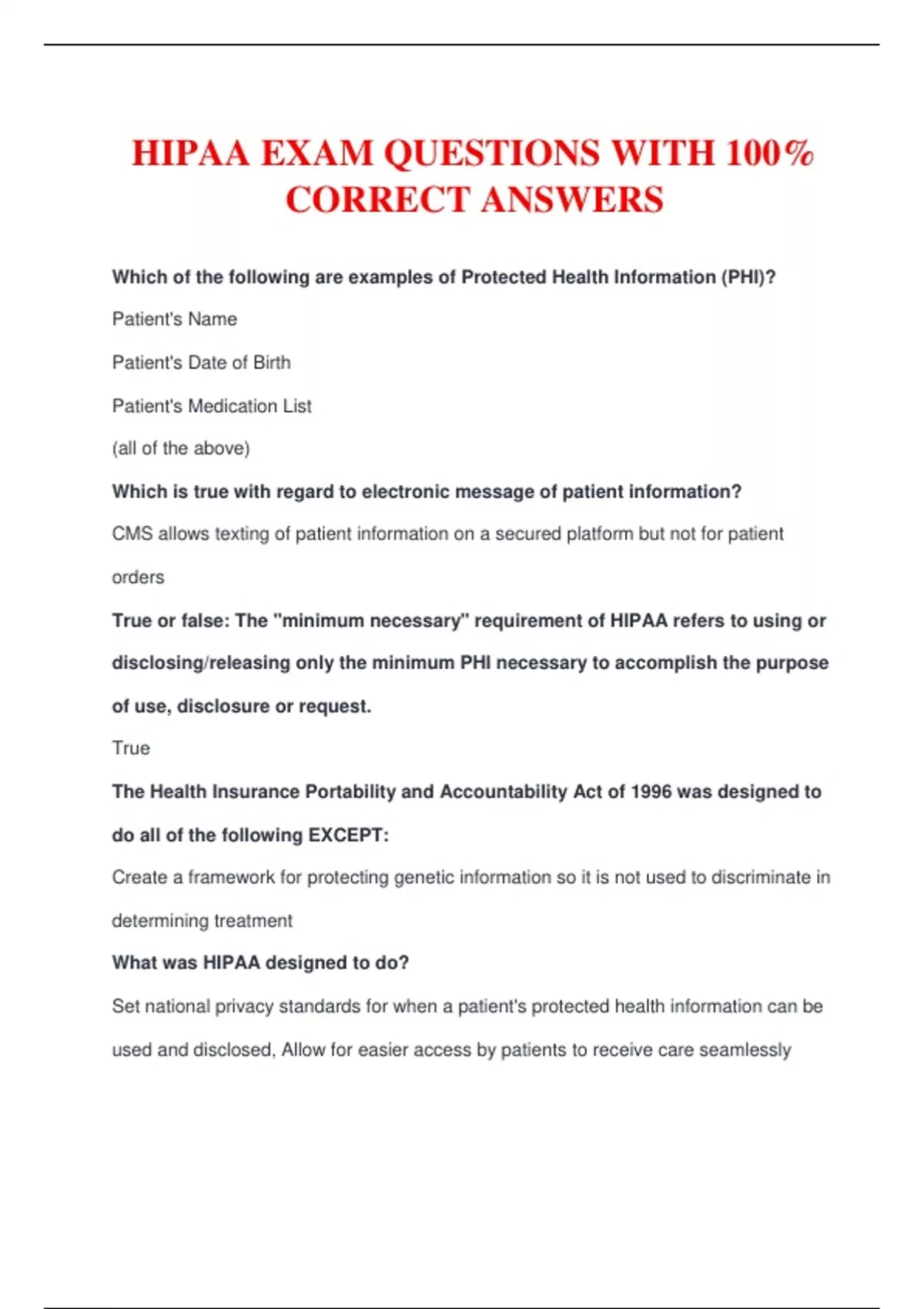 HIPAA EXAM QUESTIONS WITH 100% CORRECT ANSWERS Which of the following are examples of Protected Health Information (PHI)? Patient's Name Patient's Date of Birth Patient's Medication List (all of the above) Which is true with regard to electronic message of patient information? CMS allows texting of patient information on a secured platform but not for patient orders True or false: The "minimum necessary" requirement of HIPAA refers to using or disclosing/releasing only the minimum PHI necessary to accomplish the purpose of use, disclosure or request. True The Health Insurance Portability and Accountability Act of 1996 was designed to do all of the following EXCEPT: Create a framework for protecting genetic information so it is not used to discriminate in determining treatment What was HIPAA designed to do? Set national privacy standards for when a patient's protected health information can be used and disclosed, Allow for easier access by patients to receive care seamlessly