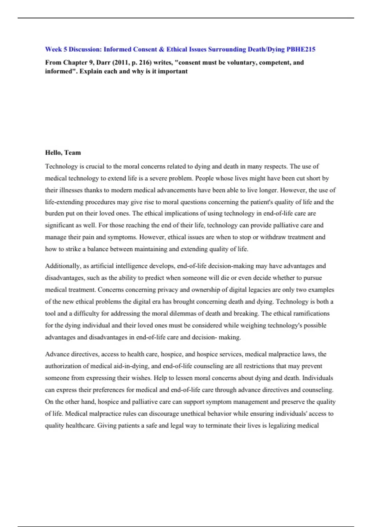 PBHE215 Week 5 Discussion; Informed Consent & Ethical Issues Surrounding Death Dying
