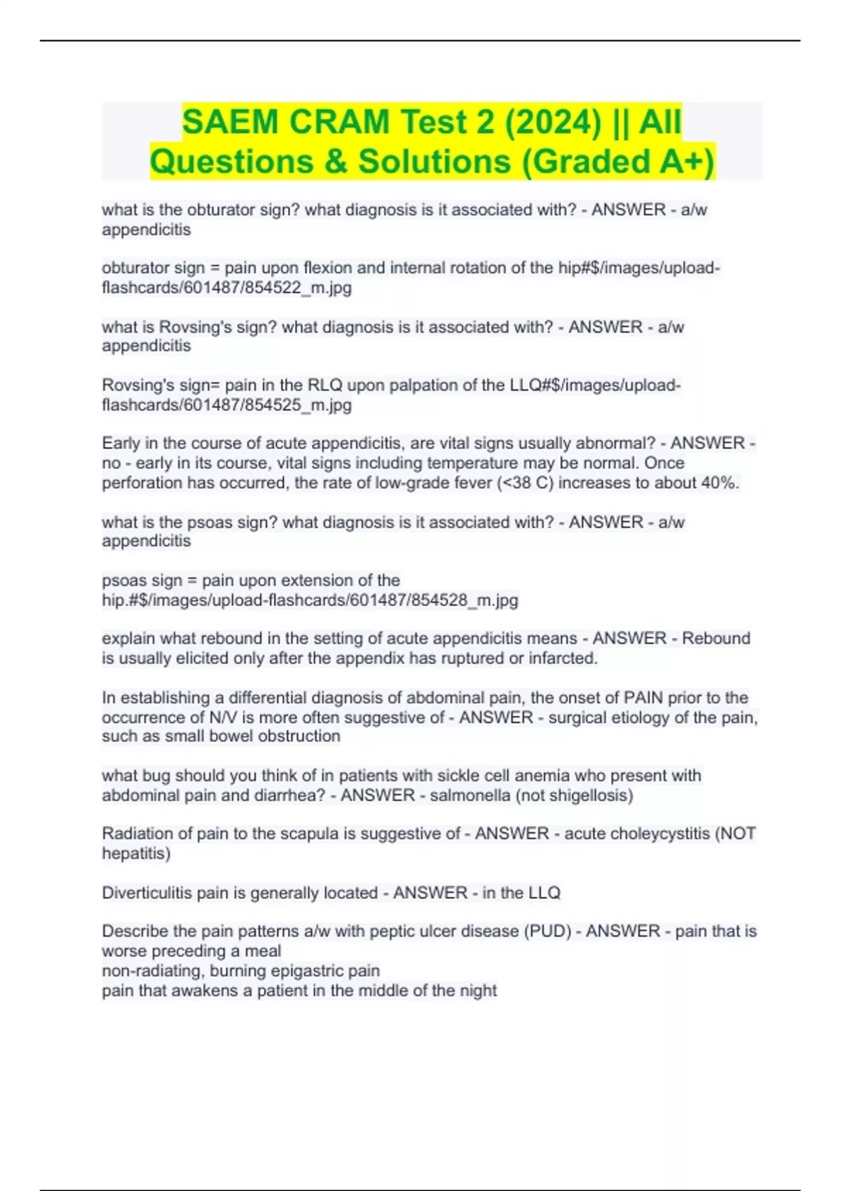 SAEM CRAM Test 2 (2024) || All Questions & Solutions (Graded A+) SAEM CRAM Test 2 (2024) || All Questions & Solutions (Graded A+) what is the obturator sign? what diagnosis is it associated with? - ANSWER - a/w appendicitis obturator sign = pain upon flexion and internal rotation of the hip#$/images/upload-flashcards/601487/854522_ what is Rovsing's sign? what diagnosis is it associated with? - ANSWER - a/w appendicitis Rovsing's sign= pain in the RLQ upon palpation of the LLQ#$/images/upload-flashcards/601487/854525_ Early in the course of acute appendicitis, are vital signs usually abnormal? - ANSWER - no - early in its course, vital signs including temperature may be normal. Once perforation has occurred, the rate of low-grade fever (38 C) increases to about 40%. what is the psoas sign? what diagnosis is it associated with? - ANSWER - a/w appendicitis psoas sign = pain upon extension of the hip.#$/images/upload-flashcards/601487/854528_ explain what rebound in the setting of acute appendicitis means - ANSWER - Rebound is usually elicited only after the appendix has ruptured or infarcted. In establishing a differential diagnosis of abdominal pain, the onset of PAIN prior to the occurrence of N/V is more often suggestive of - ANSWER - surgical etiology of the pain, such as small bowel obstruction what bug should you think of in patients with sickle cell anemia who present with abdominal pain and diarrhea? - ANSWER - salmonella (not shigellosis) Radiation of pain to the scapula is suggestive of - ANSWER - acute choleycystitis (NOT hepatitis) Diverticulitis pain is generally located - ANSWER - in the LLQ Describe the pain patterns a/w with peptic ulcer disease (PUD) - ANSWER - pain that is worse preceding a meal non-radiating, burning epigastric pain pain that awakens a patient in the middle of the night relief of abdominal pain with antacids note: unrelenting pain over a period of weeks should suggest an alternative diagnosis