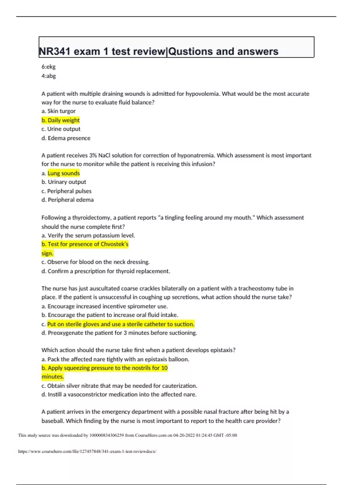 NR341 exam 1 test review|Qustions and answers 6:ekg 4:abg A patient with multiple draining wounds is admitted for hypovolemia. What would be the most accurate way for the nurse to evaluate fluid balance? a. Skin turgor b. Daily weight c. Urine output d. Edema presence A patient receives 3% NaCl solution for correction of hyponatremia. Which assessment is most important for the nurse to monitor while the patient is receiving this infusion? a. Lung sounds b. Urinary output c. Peripheral pulses d. Peripheral edema Following a thyroidectomy, a patient reports “a tingling feeling around my mouth.” Which assessment should the nurse complete first? a. Verify the serum potassium level. b. Test for presence of Chvostek’s sign. c. Observe for blood on the neck dressing. d. Confirm a prescription for thyroid replacement. The nurse has just auscultated coarse crackles bilaterally on a patient with a tracheostomy tube in place. If the patient is unsuccessful in coughing up secretions, what action should the nurse take? a. Encourage increased incentive spirometer use. b. Encourage the patient to increase oral fluid intake. c. Put on sterile gloves and use a sterile catheter to suction. d. Preoxygenate the patient for 3 minutes before suctioning. Which action should the nurse take first when a patient develops epistaxis? a. Pack the affected nare tightly with an epistaxis balloon. b. Apply squeezing pressure to the nostrils for 10 minutes. c. Obtain silver nitrate that may be needed for cauterization. d. Instill a vasoconstrictor medication into the affected nare. A patient arrives in the emergency department with a possible nasal fracture after being hit by a baseball. Which finding by the nurse is most important to report to the health care provider? a. Clear nasal drainage b. Report of nasal pain c. Bilateral nose swelling and bruising d. Inability to breathe through the nose When assessing a patient with a sore throat, the nurse notes anterior cervical lymph node swelling, a temperature of 101.6° F (38.7° C), and yellow patches on the tonsils. Which action will the nurse anticipate taking? a. Teach the patient about the use of expectorants. b. Use a swab to obtain a sample for a rapid strep antigen test. c. Discuss the need to rinse the mouth out after using any inhalers. d. Teach the patient to avoid nonsteroidal anti-inflammatory drugs (NSAIDs). A patient with respiratory failure has a respiratory rate of 6 breaths/min and an oxygen saturation (SpO2) of 78%. The patient is increasingly lethargic. Which intervention will the nurse anticipate? a. Administration of 100% O2 by non-rebreather mask b. Endotracheal intubation and positive pressure ventilation c. Insertion of a mini-tracheostomy with frequent suctioning The oxygen saturation (SpO2) for a patient with left lower lobe pneumonia is 90%. The patient has wheezes and a weak cough effort. Which action should the nurse take? a. Position the patient on the left side. b. Assist the patient with staged coughing. c. Place a humidifier in the patient’s room. d. Schedule a 4-hour rest period for the patient. A nurse is caring for a patient with right lower lobe pneumonia who is obese. Which position will provide the best gas exchange? a. On the lef t side b. On the right side c. In the tripod position d. In the high-Fowler’s position A nurse is caring for a patient who is orally intubated and receiving mechanical ventilation. To decrease the risk for ventilator-associated pneumonia, which action will the nurse include in the plan of care? a. Elevate head of bed to 30 to 45 degrees. b. Give enteral feedings at no more than 10 mL/hr. c. Suction the endotracheal tube every 2 to 4 hours. d. Limit the use of positive end-expiratory pressure. A patient admitted with acute respiratory failure has ineffective airway clearance from thick secretions. Which nursing intervention would specifically address this patient problem? a. Encourage use of the incentive spirometer. b. Offer the patient fluids at frequent intervals.