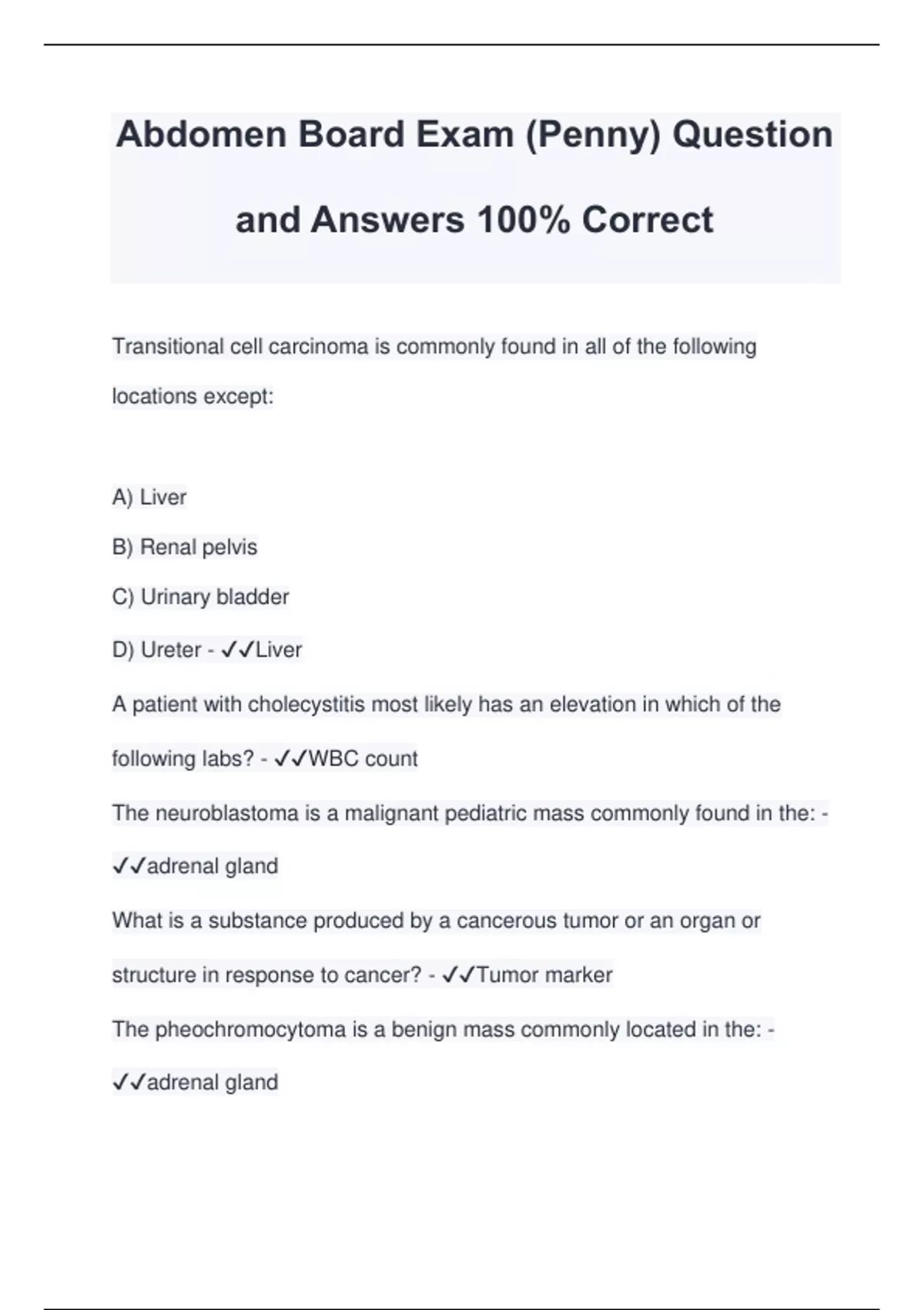 Abdomen Board Exam (Penny) Question and Answers 100% Correct Transitional cell carcinoma is commonly found in all of the following locations except: A) Liver B) Renal pelvis C) Urinary bladder D) Ureter - Liver A patient with cholecystitis most likely has an elevation in which of the following labs? - WBC count The neuroblastoma is a malignant pediatric mass commonly found in the: - adrenal gland What is a substance produced by a cancerous tumor or an organ or structure in response to cancer? - Tumor marker The pheochromocytoma is a benign mass commonly located in the: - adrenal gland