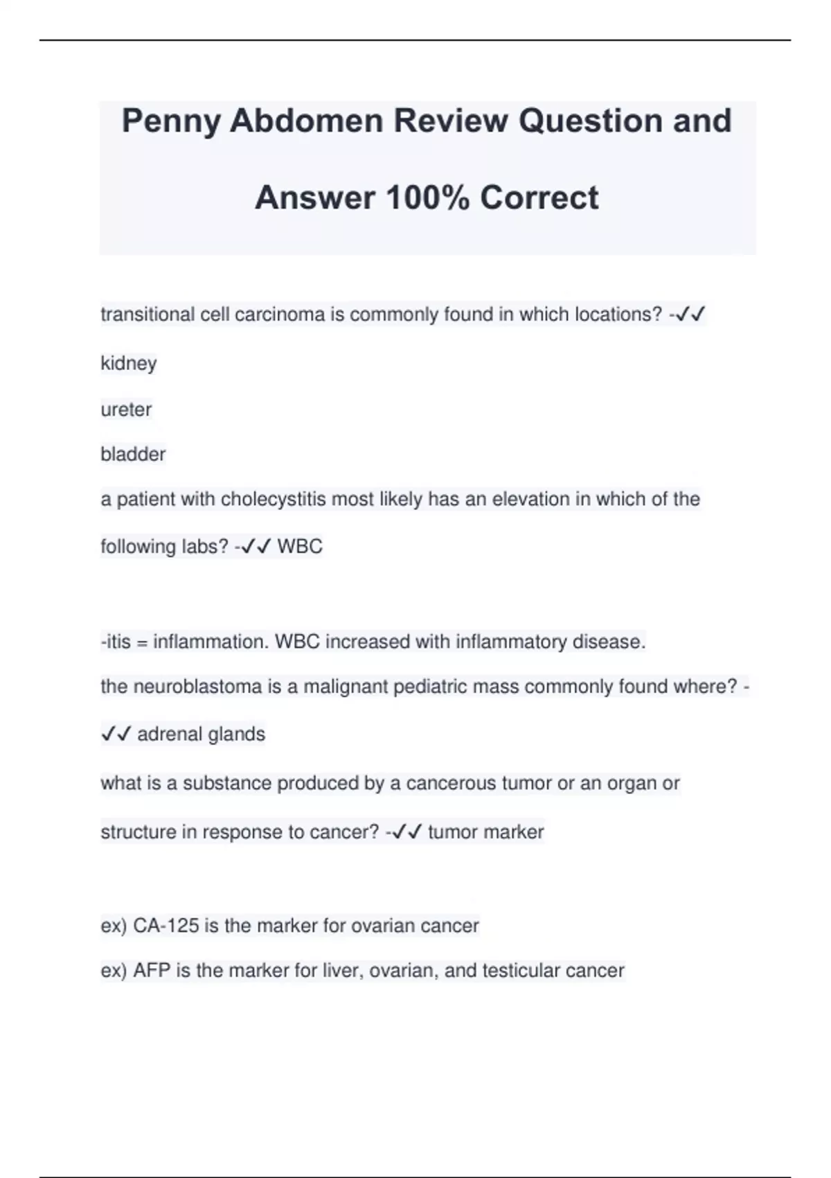 Penny Abdomen Review Question and Answer 100% Correct transitional cell carcinoma is commonly found in which locations? - kidney ureter bladder a patient with cholecystitis most likely has an elevation in which of the following labs? - WBC -itis = inflammation. WBC increased with inflammatory disease. the neuroblastoma is a malignant pediatric mass commonly found where? - adrenal glands what is a substance produced by a cancerous tumor or an organ or structure in response to cancer? - tumor marker ex) CA-125 is the marker for ovarian cancer ex) AFP is the marker for liver, ovarian, and testicular cancer the pheochromocytoma is a benign mass commo