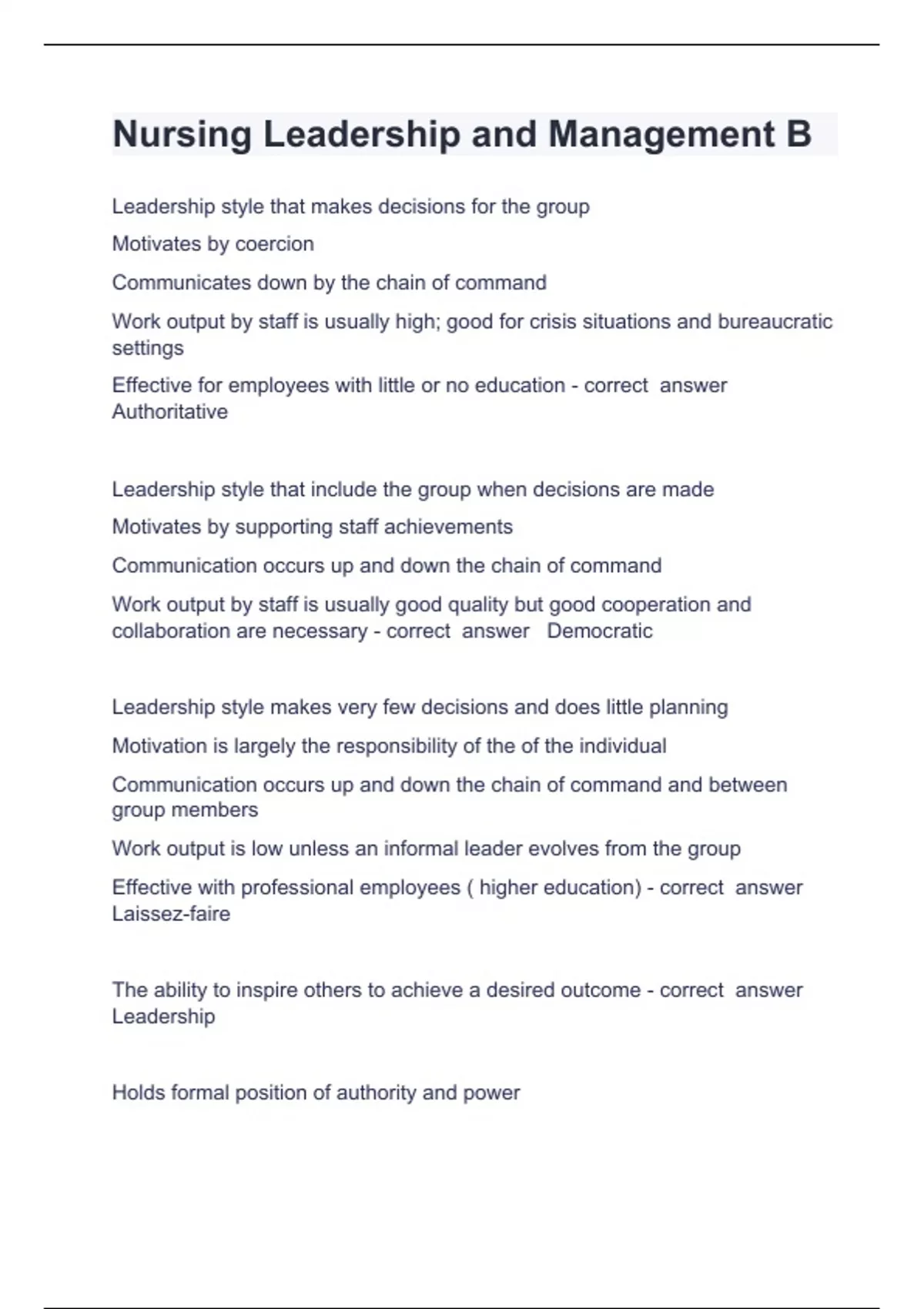 Nursing Leadership And Management Final Study Guide Questions 2024. Leadership style that makes decisions for the group Motivates by coercion Communicates down by the chain of command Work output by staff is usually high; good for crisis situations and bureaucratic settings Effective for employees with little or no education - correct answer Authoritative Leadership style that include the group when decisions are made Motivates by supporting staff achievements Communication occurs up and down the chain of command Work output by staff is usually good quality but good cooperation and collaboration are necessary - correct answer Democratic Leadership style makes very few decisions and does little planning Motivation is largely the responsibility of the of the individual Communication occurs up and down the chain of command and between group members Work output is low unless an informal leader evolves from the group Effective with professional employees ( higher education) - correct answer Laissez-faire The ability to inspire others to achieve a desired outcome - correct answer Leadership