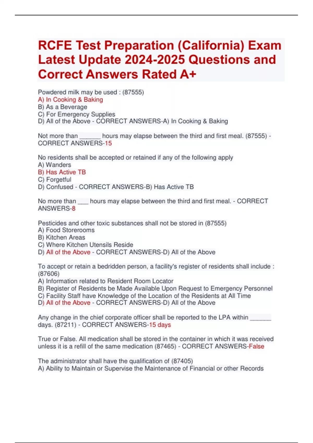 RCFE Test Preparation (California) Exam Latest Update Questions and Correct Answers Rated A+