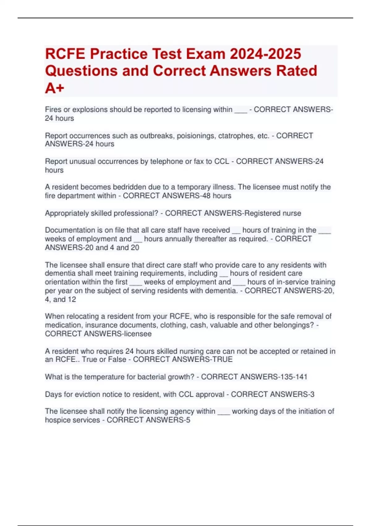 RCFE Practice Test Exam Questions and Correct Answers Rated A+