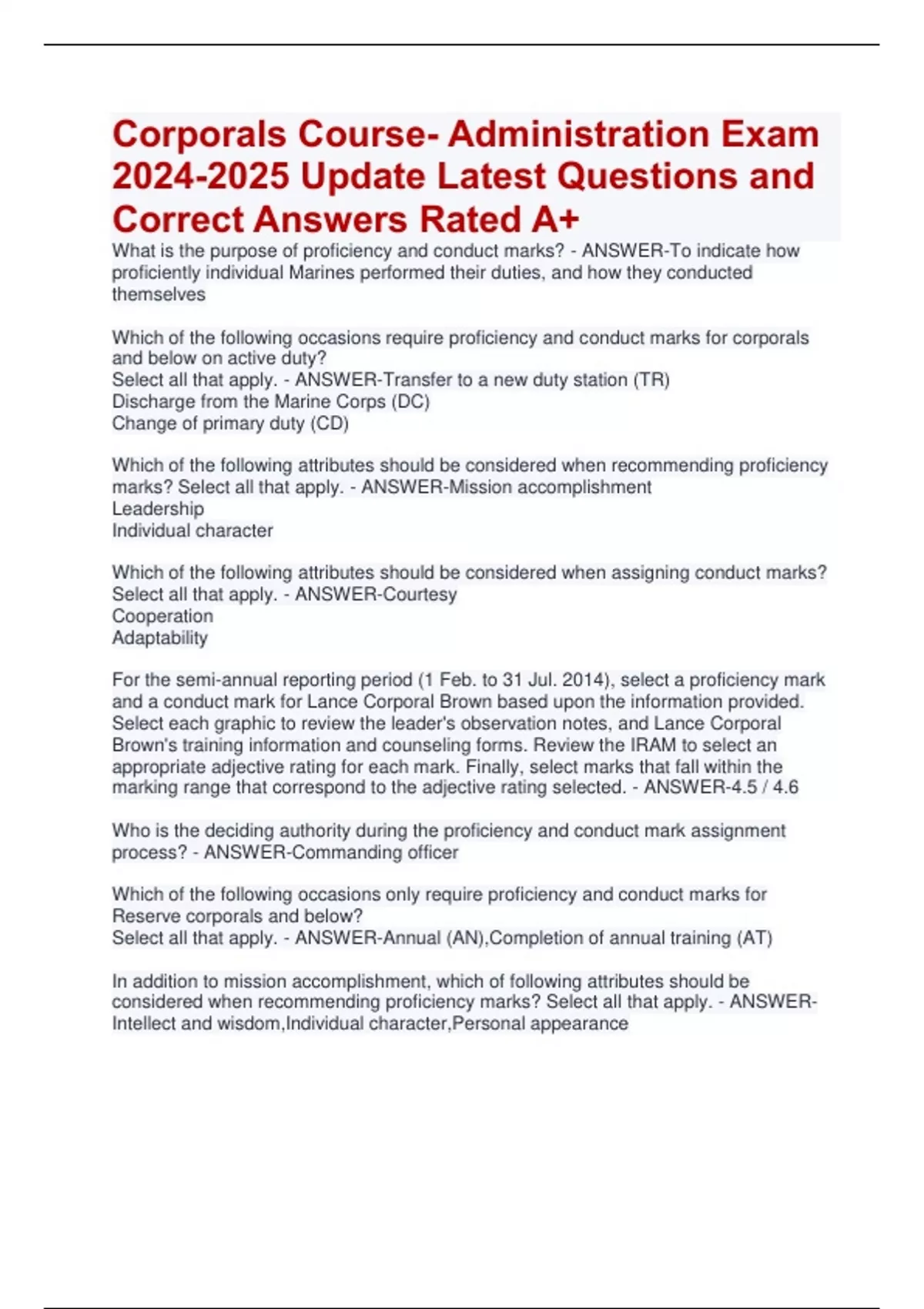 Corporals Course- Administration Exam Update Latest Questions and Correct Answers Rated A+