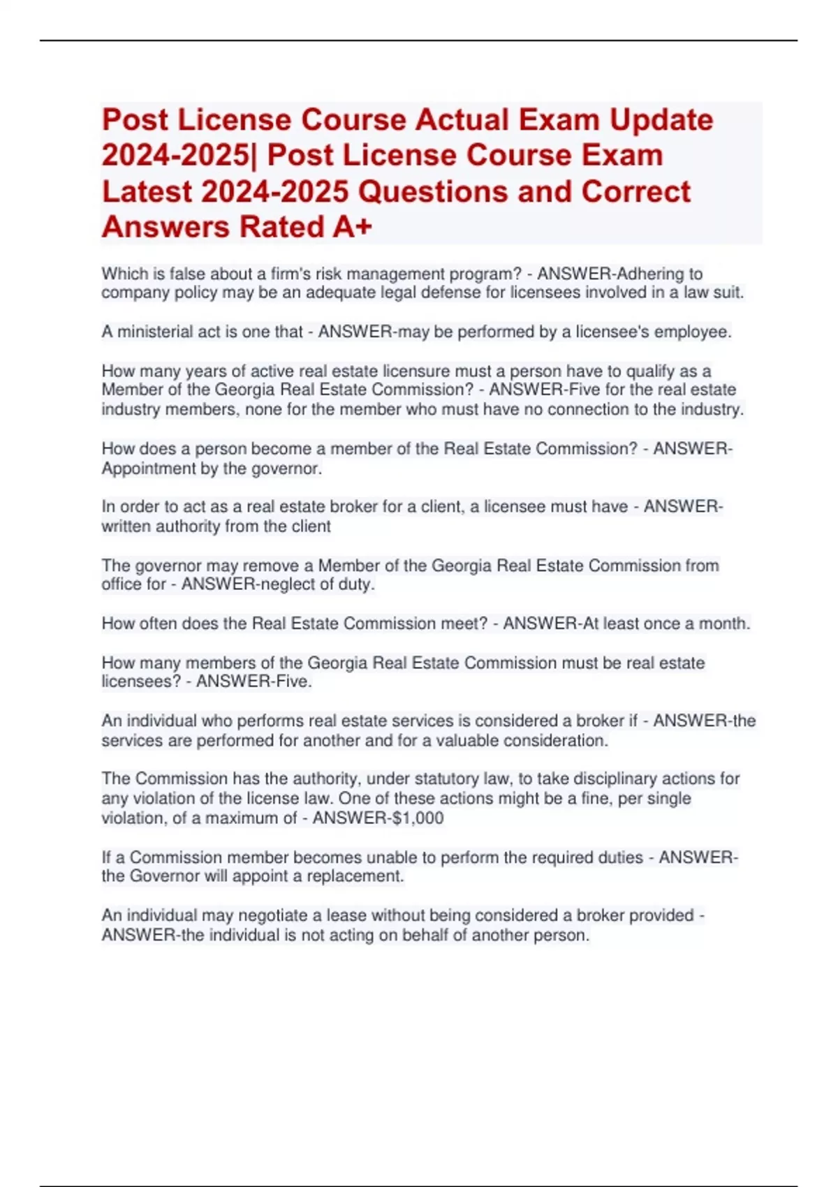 Post License Course Actual Exam Update | Post License Course Exam Latest Questions and Correct Answers Rated A+
