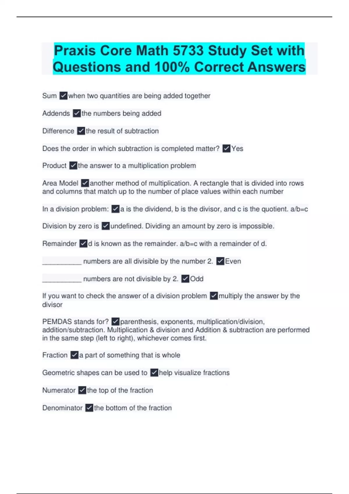 praxis core math 5733 study set with questions and