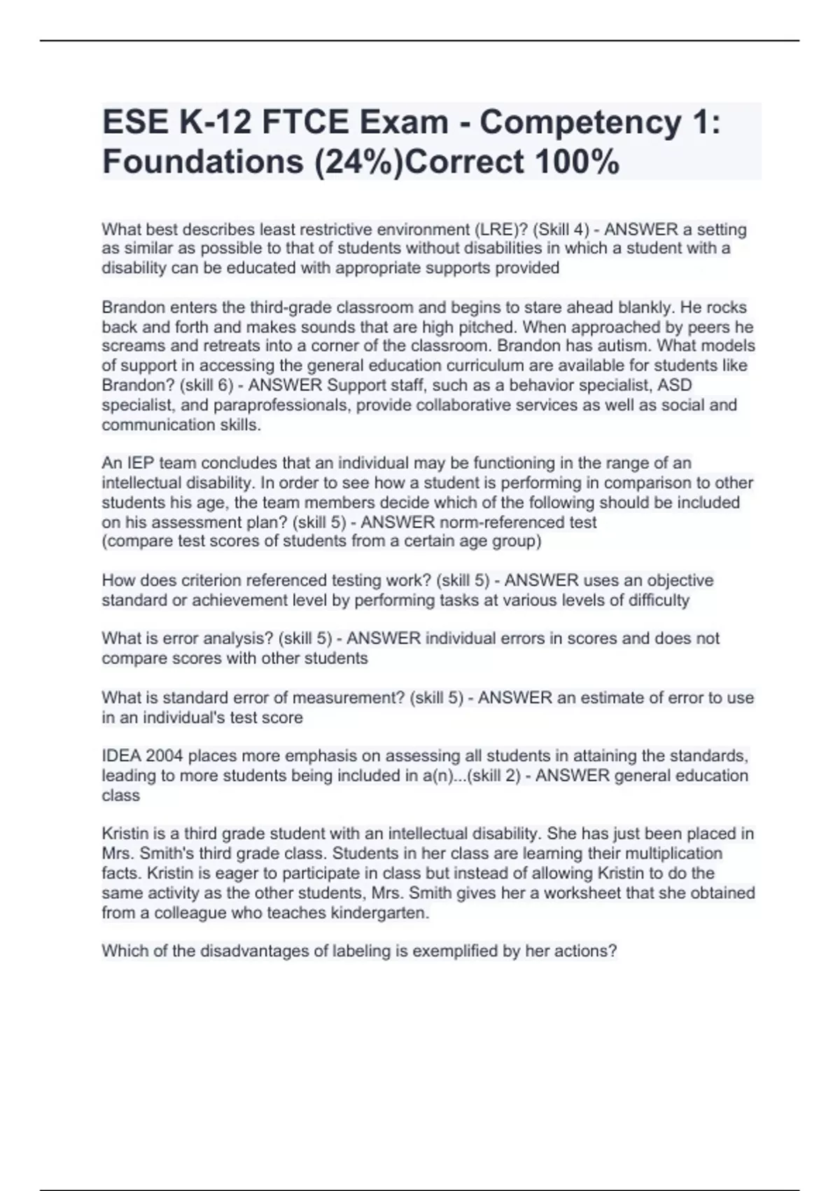 ESE K-12 FTCE Exam - Competency 1: Foundations (24%)Correct 100%