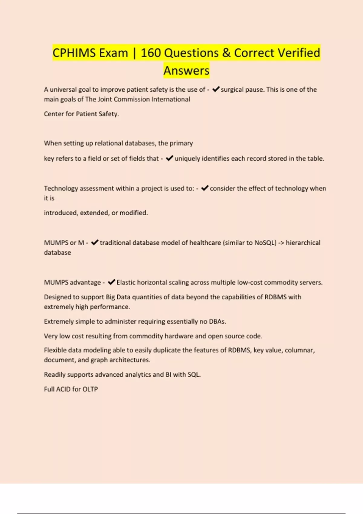 A universal goal to improve patient safety is the use of - surgical pause. This is one of the main goals of The Joint Commission International Center for Patient Safety. When setting up relational databases, the primary key refers to a field or set of fields that - uniquely identifies each record stored in the table. Technology assessment within a project is used to: - consider the effect of technology when it is introduced, extended, or modified