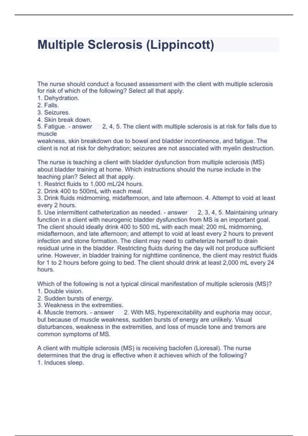Multiple Sclerosis (Lippincott) Questions and Answers 2024