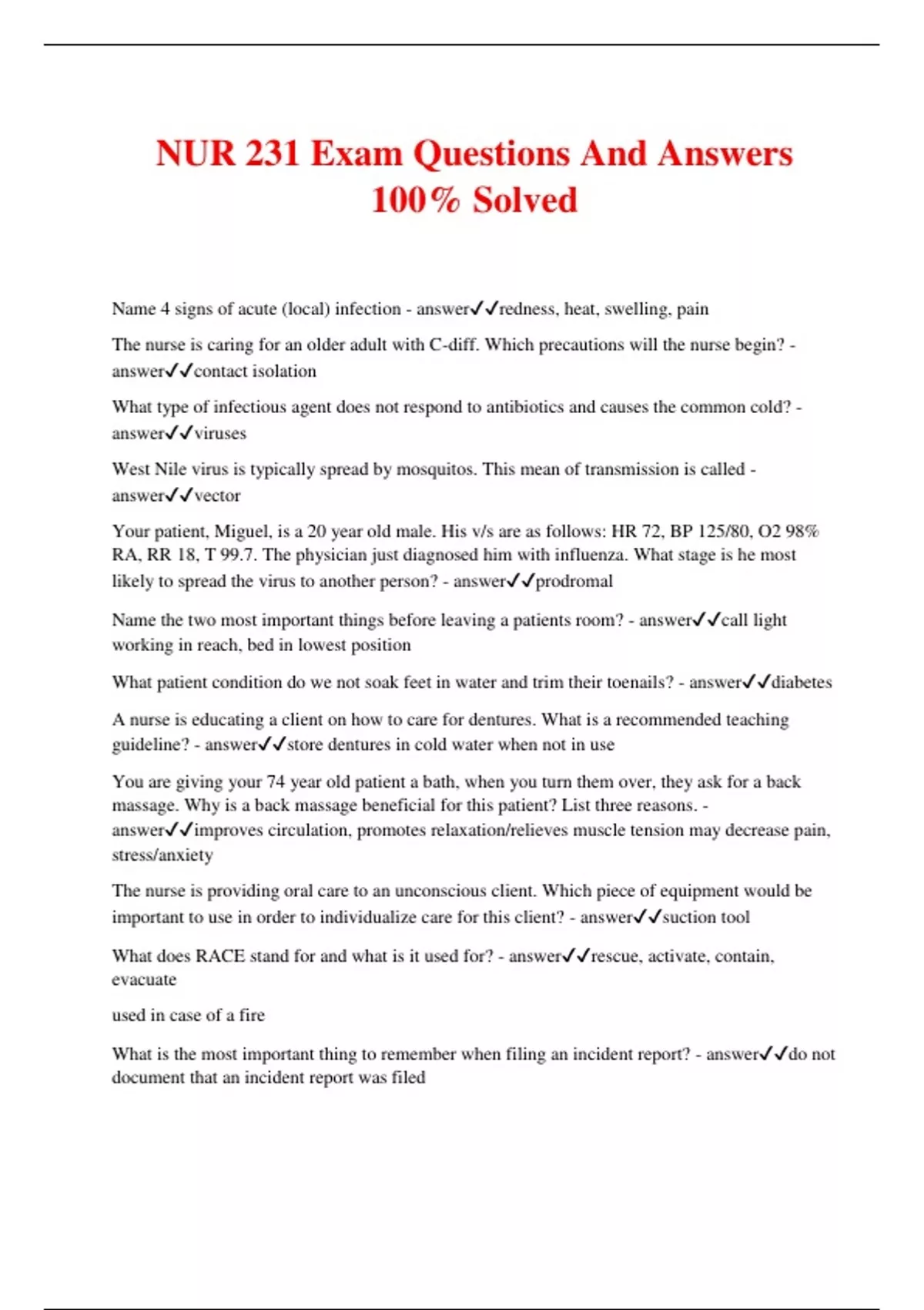 NUR 231 Exam Questions And Answers 100% Solved Name 4 signs of acute (local) infection - answerredness, heat, swelling, pain The nurse is caring for an older adult with C-diff. Which precautions will the nurse begin? - answercontact isolation What type of infectious agent does not respond to antibiotics and causes the common cold? - answerviruses West Nile virus is typically spread by mosquitos. This mean of transmission is called - answervector Your patient, Miguel, is a 20 year old male. His v/s are as follows: HR 72, BP 125/80, O2 98% RA, RR 18, T 99.7. The physician just diagnosed him with influenza. What stage is he most likely to spread the virus to another person? - answerprodromal Name the two most important things before leaving a patients room? - answercall light working in reach, bed in lowest position What patient condition do we not soak feet in water and trim their toenails? - answerdiabetes A nurse is educating a client on how to care for dentures. What is a recommended teaching guideline? - answerstore dentures in cold water when not in use You are giving your 74 year old patient a bath, when you turn them over, they ask for a back massage. Why is a back massage beneficial for this patient? List three reasons. - answerimproves circulation, promotes relaxation/relieves muscle tension may decrease pain, stress/anxiety The nurse is providing oral care to an unconscious client. Which piece of equipment would be important to use in order to individualize care for this client? - answersuction tool What does RACE stand for and what is it used for? - answerrescue, activate, contain, evacuate used in case of a fire What is the most important thing to remember when filing an incident report? - answerdo not document that an incident report was filed
