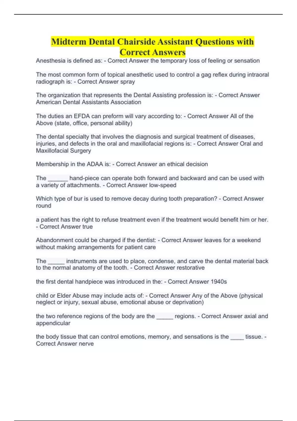 Anesthesia is defined as: - Correct Answer the temporary loss of feeling or sensation The most common form of topical anesthetic used to control a gag reflex during intraoral radiograph is: - Correct Answer spray The organization that represents the Dental Assisting profession is: - Correct Answer American Dental Assistants Association The duties an EFDA can preform will vary according to: - Correct Answer All of the Above (state, office, personal ability) The dental specialty that involves the diagnosis and surgical treatment of diseases, injuries, and defects in the oral and maxillofacial regions is: - Correct Answer Oral and Maxillofacial Surgery Membership in the ADAA is: - Correct Answer an ethical decision The ______ hand-piece can operate both forward and backward and can be used with a variety of attachments. - Correct Answer low-speed Which type of bur is used to remove decay during tooth preparation? - Correct Answer round a patient has the right to refuse treatment even if the treatment would benefit him or her. - Correct Answer true Abandonment could be charged if the dentist: - Correct Answer leaves for a weekend without making arrangements for patient care The _____ instruments are used to place, condense, and carve the dental material back to the normal anatomy of the tooth. - Correct Answer restorative the first dental handpiece was introduced in the: - Correct Answer 1940s child or Elder Abuse may include acts of: - Correct Answer Any of the Above (physical neglect or injury, sexual abuse, emotional abuse or deprivation) the two reference regions of the body are the _____ regions. - Correct Answer axial and appendicular the body tissue that can control emotions, memory, and sensations is the ____ tissue. - Correct Answer nerve dental hand instruments: - Correct Answer must be able to withstand sterilization procedures instruments allow the operator to throughly inspect the health status of the oral cavity. - Correct Answer examination Generally, the first primary teeth to erupt into the mouth are: - Correct Answer man