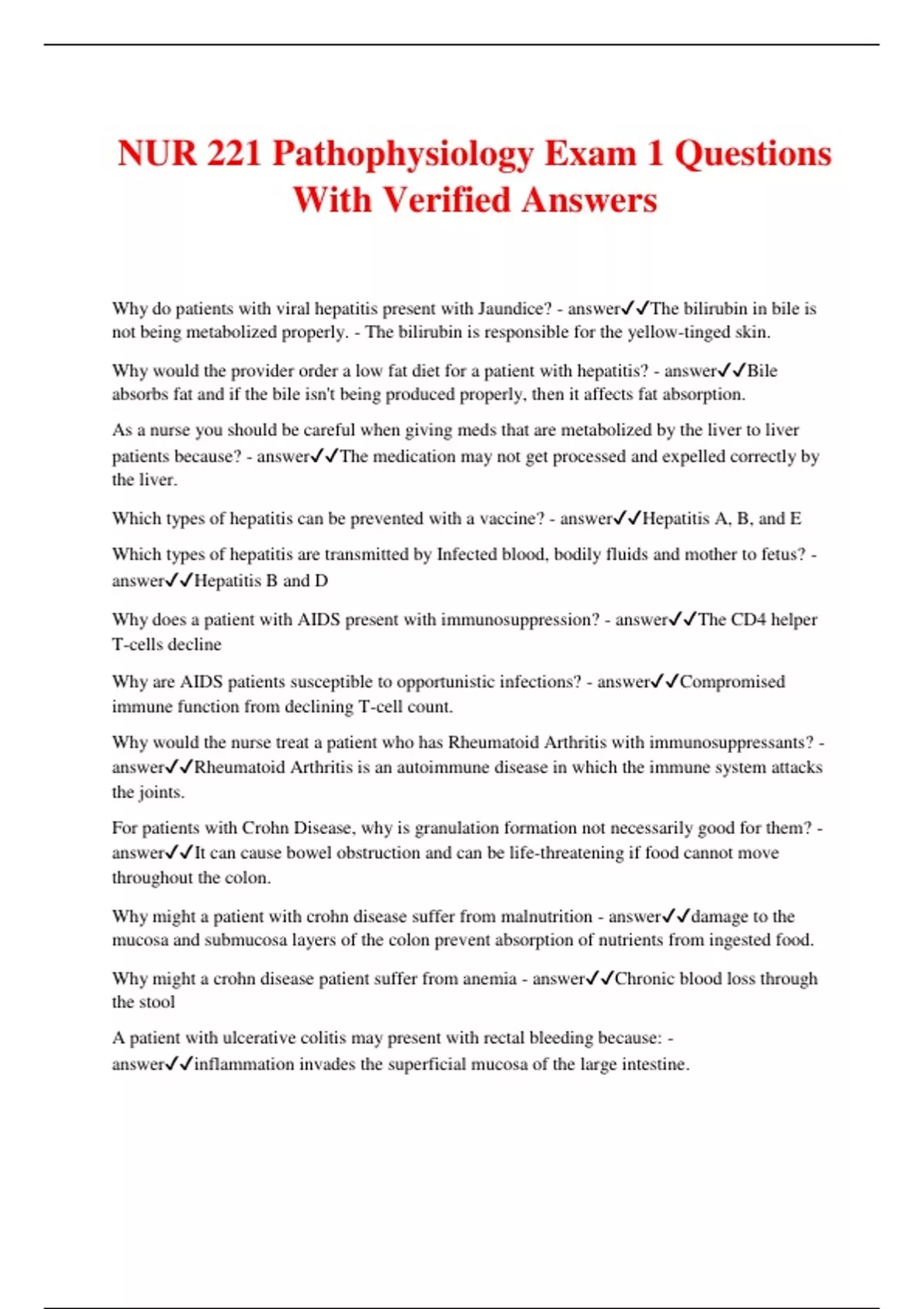 NUR 221 Pathophysiology Exam 1 Questions With Verified Answers Why do patients with viral hepatitis present with Jaundice? - answerThe bilirubin in bile is not being metabolized properly. - The bilirubin is responsible for the yellow-tinged skin. Why would the provider order a low fat diet for a patient with hepatitis? - answerBile absorbs fat and if the bile isn't being produced properly, then it affects fat absorption. As a nurse you should be careful when giving meds that are metabolized by the liver to liver patients because? - answerThe medication may not get processed and expelled correctly by the liver. Which types of hepatitis can be prevented with a vaccine? - answerHepatitis A, B, and E Which types of hepatitis are transmitted by Infected blood, bodily fluids and mother to fetus? - answerHepatitis B and D Why does a patient with AIDS present with immunosuppression? - answerThe CD4 helper T-cells decline Why are AIDS patients susceptible to opportunistic infections? - answerCompromised immune function from declining T-cell count. Why would the nurse treat a patient who has Rheumatoid Arthritis with immunosuppressants? - answerRheumatoid Arthritis is an autoimmune disease in which the immune system attacks the joints. For patients with Crohn Disease, why is granulation formation not necessarily good for them? - answerIt can cause bowel obstruction and can be life-threatening if food cannot move throughout the colon. Why might a patient with crohn disease suffer from malnutrition - answerdamage to the mucosa and submucosa layers of the colon prevent absorption of nutrients from ingested food. Why might a crohn disease patient suffer from anemia - answerChronic blood loss through the stool A patient with ulcerative colitis may present with rectal bleeding because: - answerinflammation invades the superficial mucosa of the large intestine.