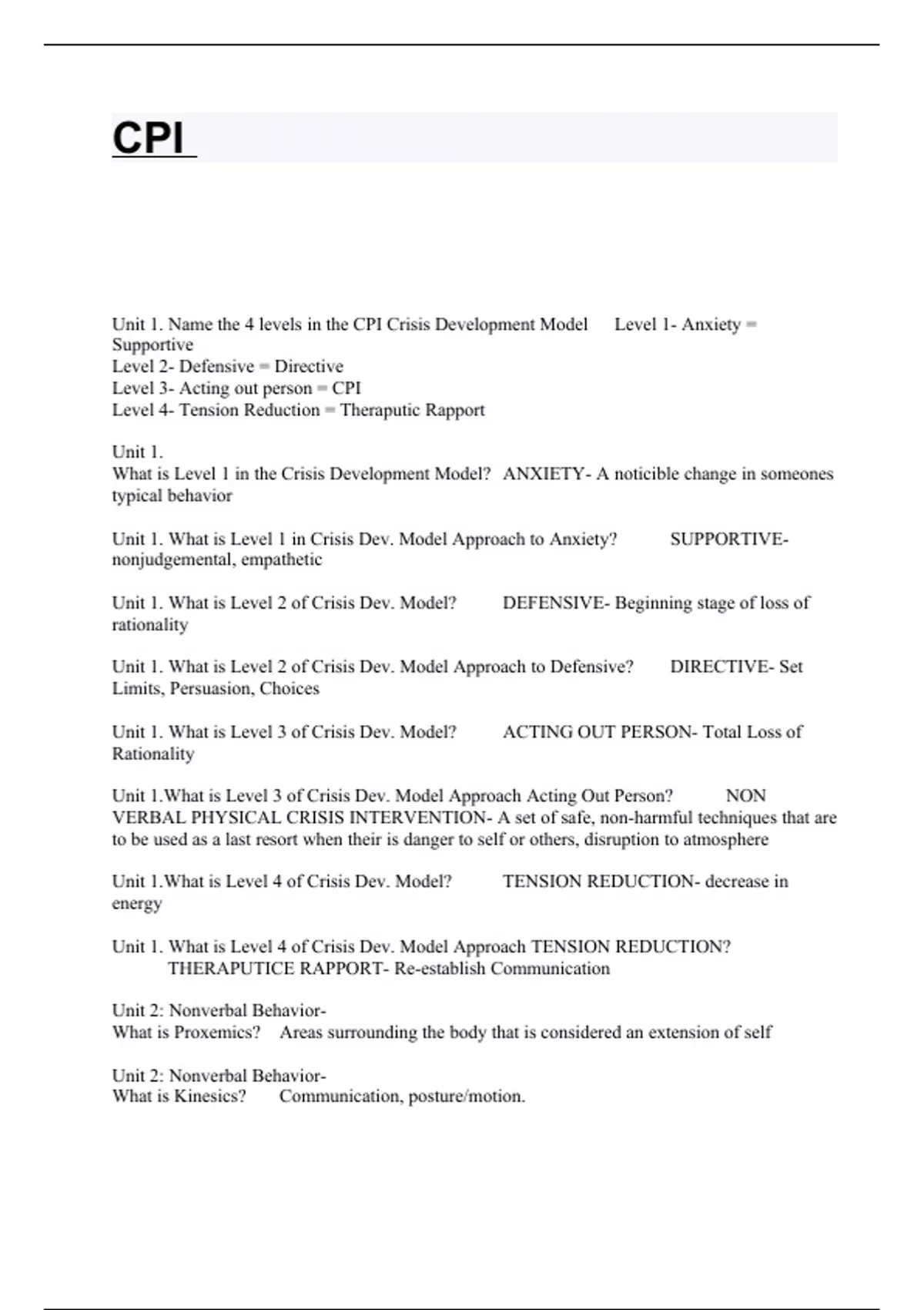 CPI Unit 1. Name the 4 levels in the CPI Crisis Development Model Level 1- Anxiety = Supportive Level 2- Defensive = Directive Level 3- Acting out person = CPI Level 4- Tension Reduction = Theraputic Rapport Unit 1. What is Level 1 in the Crisis Development Model? ANXIETY- A noticible change in someones typical behavior Unit 1. What is Level 1 in Crisis Dev. Model Approach to Anxiety? SUPPORTIVE- nonjudgemental, empathetic Unit 1. What is Level 2 of Crisis Dev. Model? DEFENSIVE- Beginning stage of loss of rationality Unit 1. What is Level 2 of Crisis Dev. Model Approach to Defensive? DIRECTIVE- Set Limits, Persuasion, Choices Unit 1. What is Level 3 of Crisis Dev. Model? ACTING OUT PERSON- Total Loss of Rationality Unit 1.What is Level 3 of Crisis Dev. Model Approach Acting Out Person? NON VERBAL PHYSICAL CRISIS INTERVENTION- A set of safe, non-harmful techniques that are to be used as a last resort when their is danger to self or others, disruption to atmosphere Unit 1.What is Level 4 of Crisis Dev. Model? TENSION REDUCTION- decrease in energy Unit 1. What is Level 4 of Crisis Dev. Model Approach TENSION REDUCTION? THERAPUTICE RAPPORT- Re-establish Communication Unit 2: Nonverbal Behavior- What is Proxemics? Areas surrounding the body that is considered an extension of self Unit 2: Nonverbal Behavior- What is Kinesics? Communication, posture/motion. the non verbal message transmitted by motion and posture of the body. Unit 2: Nonverbal Behavior- What are the for Reasons for using CPI Stance? 1. Safety 2. Less Threatening 3. Show honor and respect Unit 3: Paraverbal Communication- What is Paraverbal Communication? How we say what we say Unit 3: Paraverbal Communication- Paraverbal Components (Total Voice Control) Tone- Avoid inflection of negativity