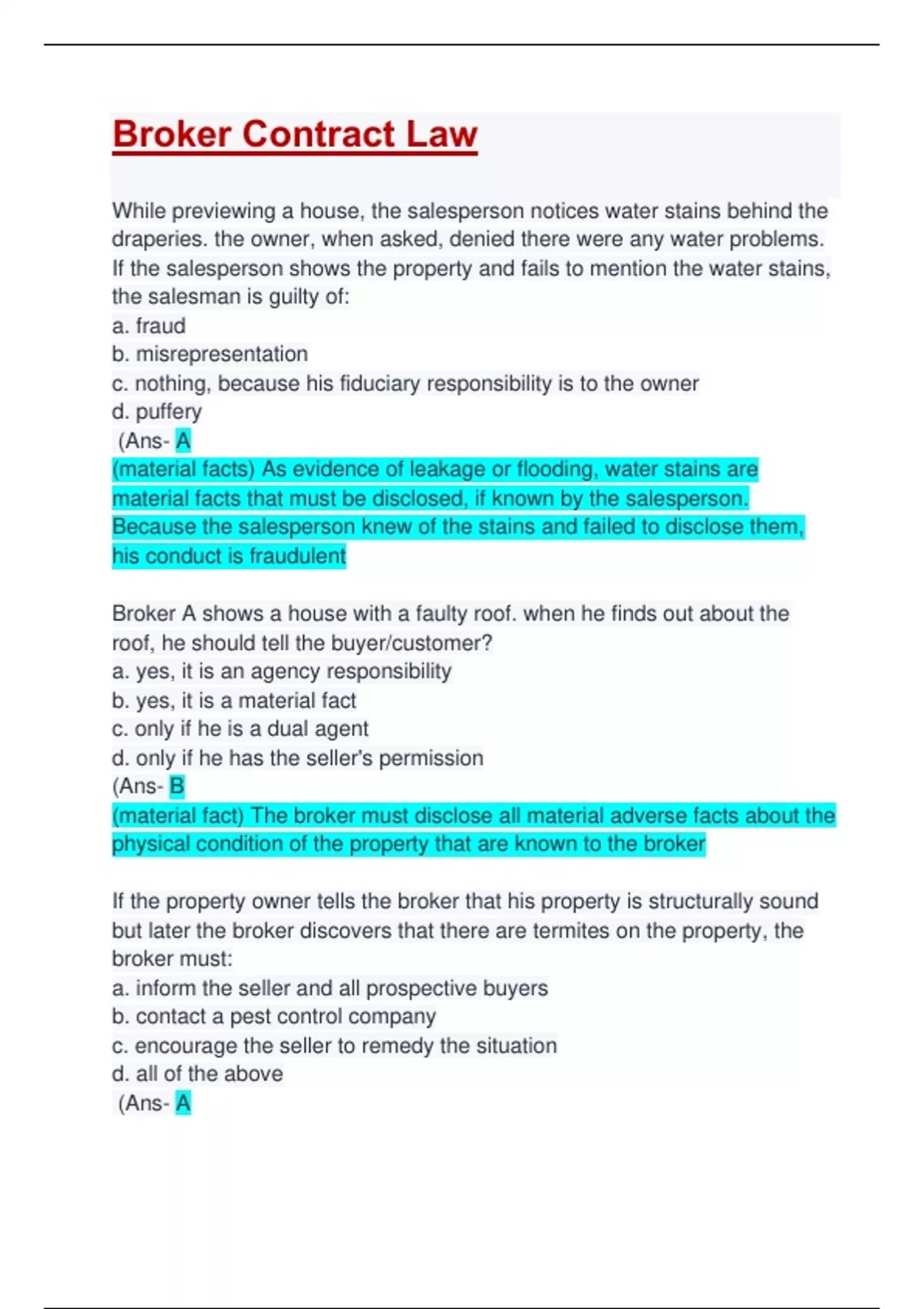 While previewing a house, the salesperson notices water stains behind the draperies. the owner, when asked, denied there were any water problems. If the salesperson shows the property and fails to mention the water stains, the salesman is guilty of: a. fraud b. misrepresentation c. nothing, because his fiduciary responsibility is to the owner d. puffery (Ans- A (material facts) As evidence of leakage or flooding, water stains are material facts that must be disclosed, if known by the salesperson. Because the salesperson knew of the stains and failed to disclose them, his conduct is fraudulent Broker A shows a house with a faulty roof. when he finds out about the roof, he should tell the buyer/customer? a. yes, it is an agency responsibility b. yes, it is a material fact c. only if he is a dual agent d. only if he has the seller's permission (Ans- B (material fact) The broker must disclose all material adverse facts about the physical condition of the property that are known to the broker If the property owner tells the broker that his property is structurally sound but later the broker discovers that there are termites on the property, the broker must: a. inform the seller and all prospective buyers b. contact a pest control company c. encourage the seller to remedy the situation d. all of the above (Ans- A all material facts known by a licensee must be disclosed to all parties in a transaction. Termite damage is a material fact however the licensee has no obligation to contact a pest control company or encourage the seller to fix problems (but the can do this Upon listing a property a broker discovers water problems in the basement. The broker should inform: a. the seller only if the broker is a seller's agent b. the buyer only if he is a buyer's agent c. both the buyer and the seller regardless of who the broker represents d. no one (Ans- C A salesperson took a listing on a property which had a crack in the foundation caused by water seepage. It was obvious the owner had filled in and painted over the crack although the owner advised the sales agent that the seepage problem had been corrected. If the salesperson shows the property without advising potential buyers of the seepage problem, the salesperson would be guilty of: a. fraud b. misrepresentation c. puffery d. nothing (Ans- A This is fraud because it is intentional concealment. The licensee is obligated to disclose known material facts about property An owner lists a house with a broker for $72,000. Two days later the broker brings an offer for $70,000. At this time, which of the following statements is true? a. the broker has found a buyer and earned his commission b. a ready, willing, and able buyer has been found and a commission is due c. a ready willing and able buyer has been found but no commission is due d. none of the above (Ans- D In order to earn a commission, the broker must find a ready, willing, and able buyer, on the terms of the seller. The offer was lower than the listed price. while the buyer is ready and willing, there is no evidence that the buyer is financially able, therefore no commission is due. A property owner, after death of his wife, lists his property with a broker. Two days later he sells the property himself but is not obligated to pay the broker a commission. What type of listing agreement did he most likely sign? a. multiple b. exclusive authorization to se