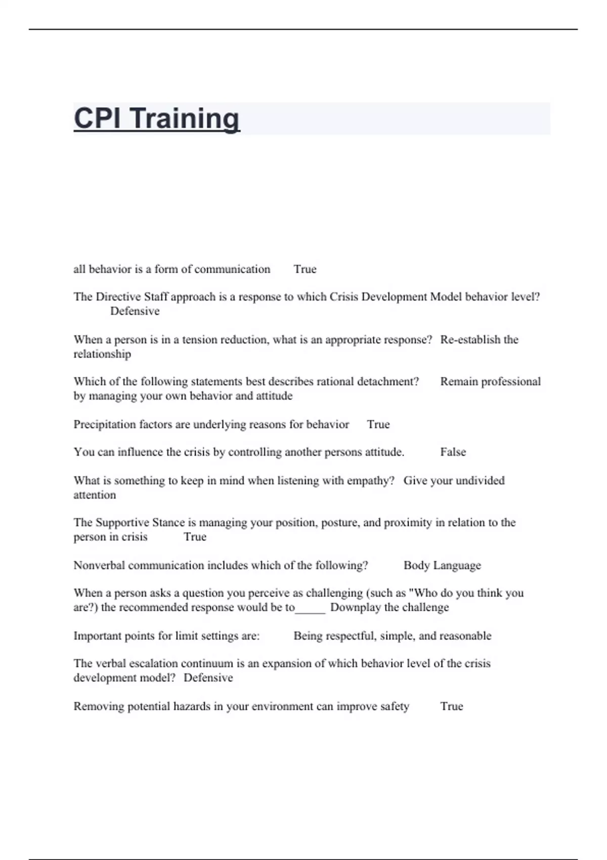 CPI Training all behavior is a form of communication True The Directive Staff approach is a response to which Crisis Development Model behavior level? Defensive When a person is in a tension reduction, what is an appropriate response? Re-establish the relationship Which of the following statements best describes rational detachment? Remain professional by managing your own behavior and attitude Precipitation factors are underlying reasons for behavior True You can influence the crisis by controlling another persons attitude. False What is something to keep in mind when listening with empathy? Give your undivided attention The Supportive Stance is managing your position, posture, and proximity in relation to the person in crisis True Nonverbal communication includes which of the following? Body Language When a person asks a question you perceive as challenging (such as "Who do you think you are?) the recommended response would be to_____ Downplay the challenge Important points for limit settings are: Being respectful, simple, and reasonable The verbal escalation continuum is an expans