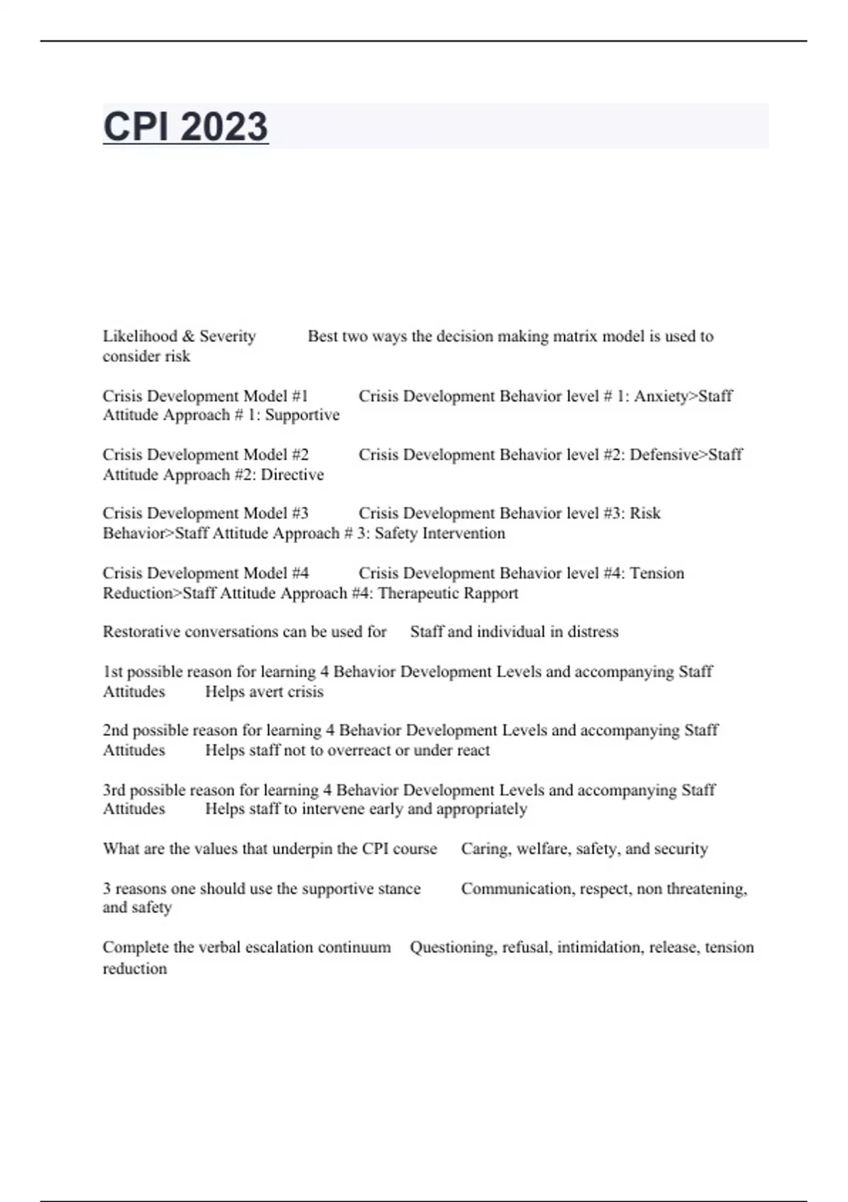 CPI 2023 Likelihood & Severity Best two ways the decision making matrix model is used to consider risk Crisis Development Model #1 Crisis Development Behavior level # 1: Anxiety>Staff Attitude Approach # 1: Supportive Crisis Development Model #2 Crisis Development Behavior level #2: Defensive>Staff Attitude Approach #2: Directive Crisis Development Model #3 Crisis Development Behavior level #3: Risk Behavior>Staff Attitude Approach # 3: Safety Intervention Crisis Development Model #4 Crisis Development Behavior level #4: Tension Reduction>Staff Attitude Approach #4: Therapeutic Rapport Restorative conversations can be used for Staff and individual in distress 1st possible reason for learning 4 Behavior Development Levels and accompanying Staff Attitudes Helps avert crisis