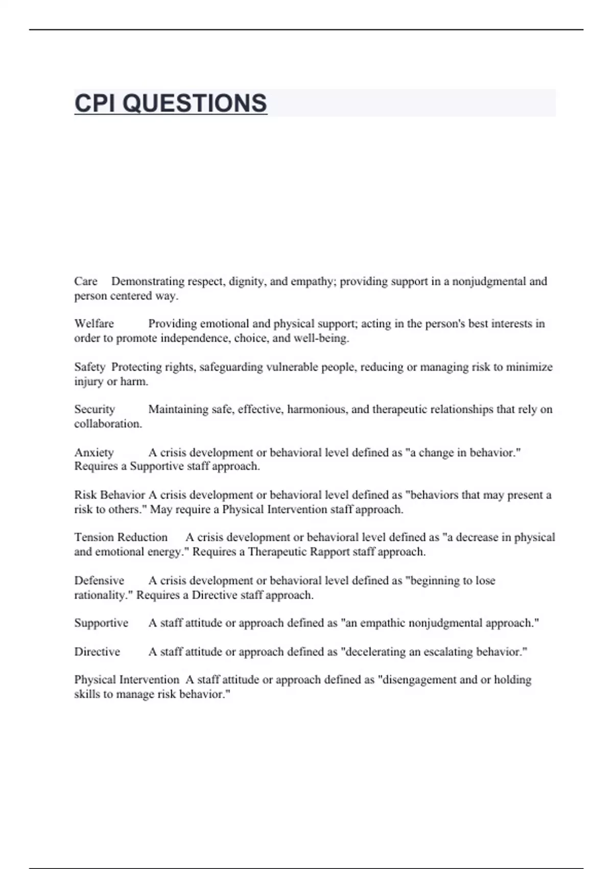 CPI QUESTIONS Care Demonstrating respect, dignity, and empathy; providing support in a nonjudgmental and person centered way. Welfare Providing emotional and physical support; acting in the person's best interests in order to promote independence, choice, and well-being. Safety Protecting rights, safeguarding vulnerable people, reducing or managing risk to minimize injury or harm. Security Maintaining safe, effective, harmonious, and therapeutic relationships that rely on collaboration. Anxiety A crisis development or behavioral level defined as "a change in behavior." Requires a Supportive staff approach. Risk Behavior A crisis development or behavioral level defined as "behaviors that may present a risk to others." May require a Physical Intervention staff approach. Tension Reduction A crisis development or behavioral level defined as "a decrease in physical and emotional energy." Requires a Therapeutic Rapport staff approach. Defensive A crisis development or behavioral level defined as "beginning to lose rationality." Requires a Directive staff approach. Supportive A staff attitude or approach defined as "an empathic nonjudgmental approach." Directive A staff attitude or approach defined as "decelerating an escalating behavior." Physical Intervention A staff attitude or approach defined as "disengagement and or holding skills to manage risk behavior." Therapeutic Rapport A staff attitude or approach defined as "the re-establishment of communication." Proxemics Personal space (as a professional tool) Kinesics Body Language Haptics Communications through touch