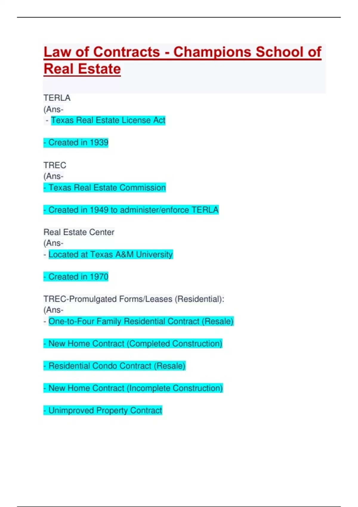 TERLA (Ans- - Texas Real Estate License Act - Created in 1939 TREC (Ans- - Texas Real Estate Commission - Created in 1949 to administer/enforce TERLA Real Estate Center (Ans- - Located at Texas A&M University - Created in 1970 TREC-Promulgated Forms/Leases (Residential): (Ans- - One-to-Four Family Residential Contract (Resale) - New Home Contract (Completed Construction) - Residential Condo Contract (Resale) - New Home Contract (Incomplete Construction) - Unimproved Property Contract - Farm and Ranch (Note: TREC has pr
