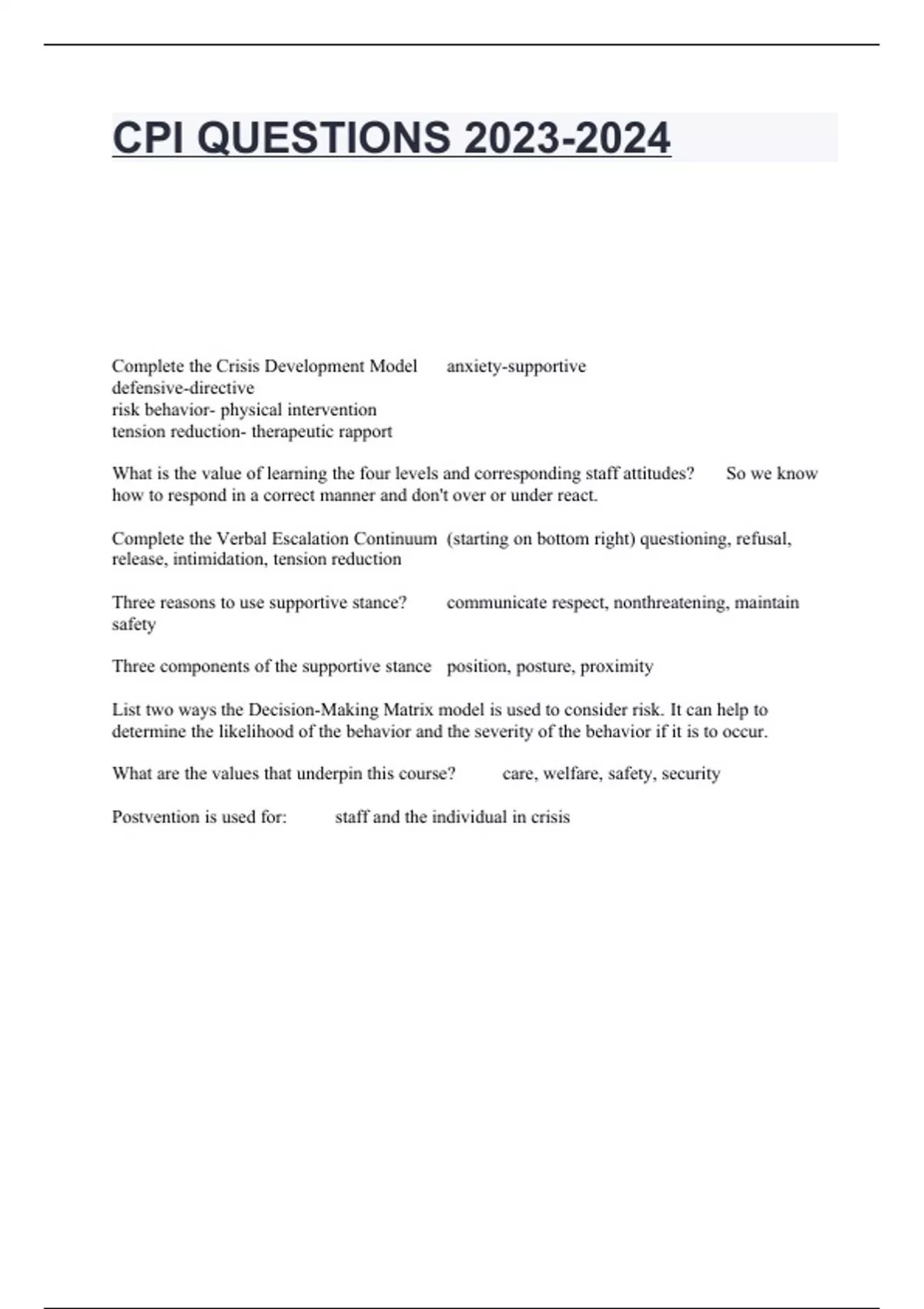 CPI QUESTIONS Complete the Crisis Development Model anxiety-supportive defensive-directive risk behavior- physical intervention tension reduction- therapeutic rapport What is the value of learning the four levels and corresponding staff attitudes? So we know how to respond in a correct manner and don't over or under react. Complete the Verbal Escalation Continuum (starting on bottom right) questioning, refusal, release, intimidation, tension reduction Three reasons to use supportive stance? communicate respect, nonthreatening, maintain safety Three components of the supportive stance position, posture, proximity