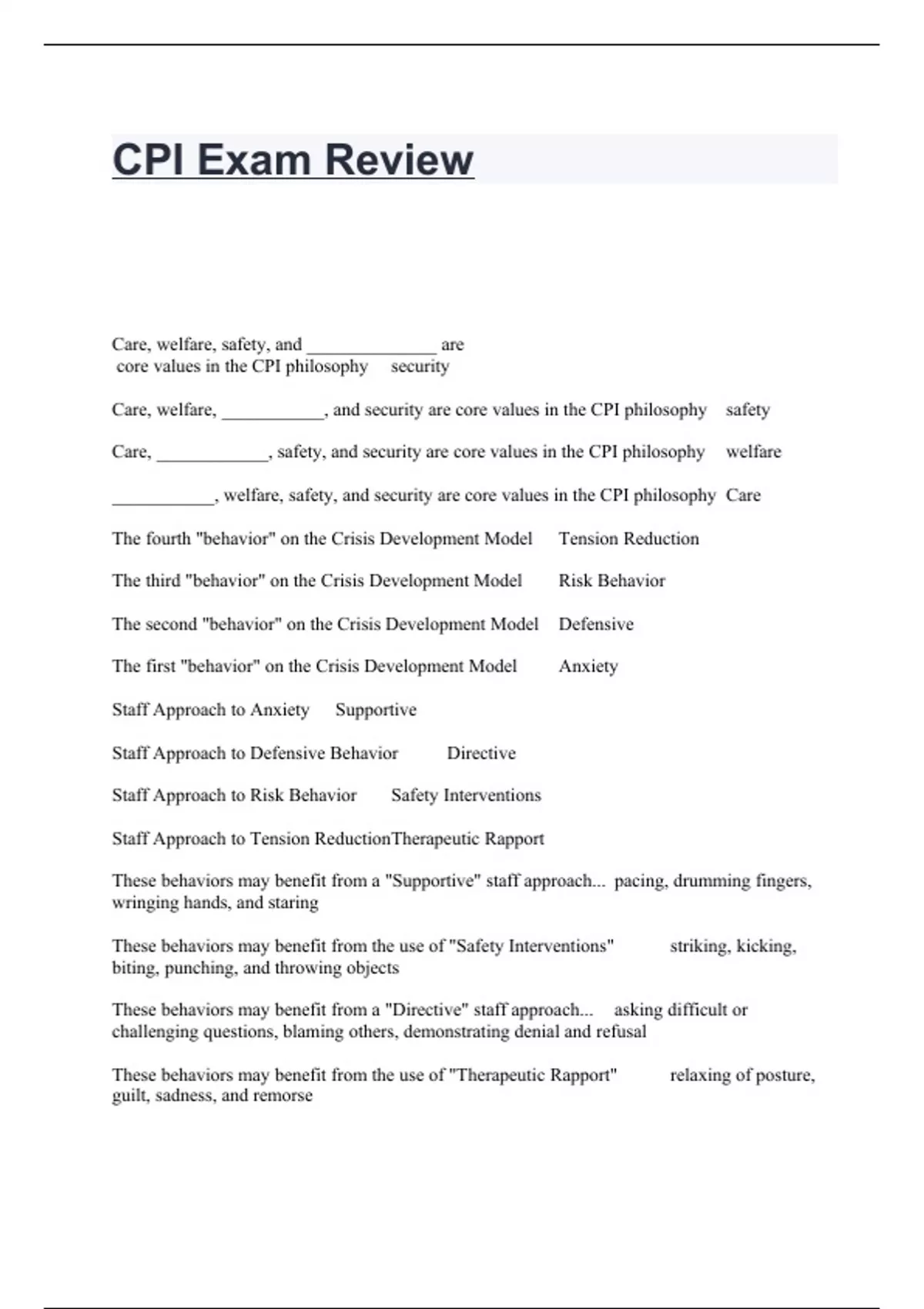 CPI Exam Review Care, welfare, safety, and ______________ are core values in the CPI philosophy security Care, welfare, ___________, and security are core values in the CPI philosophy safety Care, ____________, safety, and security are core values in the CPI philosophy welfare ___________, welfare, safety, and security are core values in the CPI philosophy Care The fourth "behavior" on the Crisis Development Model Tension Reduction The third "behavior" on the Crisis Development Model Risk Behavior The second "behavior" on the Crisis Development Model Defensive The first "behavior" on the Crisis Development Model Anxiety Staff Approach to Anxiety Supportive Staff Approach to Defensive Behavior Directive Staff Approach to Risk Behavior Safety Interventions Staff Approach to Tension Reduction Therapeutic Rapport These behaviors may benefit from a "Supportive" staff approach... pacing, drumming fingers, wringing hands, and staring These behaviors may benefit from the use of "Safety Interventions" striking, kicking, biting, punching, and throwing objects These behaviors may benefit from a "Directive" staff approach... asking difficult or challenging questions, blaming others, demonstrating denial and refusal These behaviors may benefit from the use of "Therapeutic Rapport" relaxing of posture, guilt, sadness, and remorse The distance people prefer to maintain between themselves and others is... Personal space The postures, gestures, facial expressions, and movement used to communicate are examples of... Body language A nonverbal communication tool that communicates
