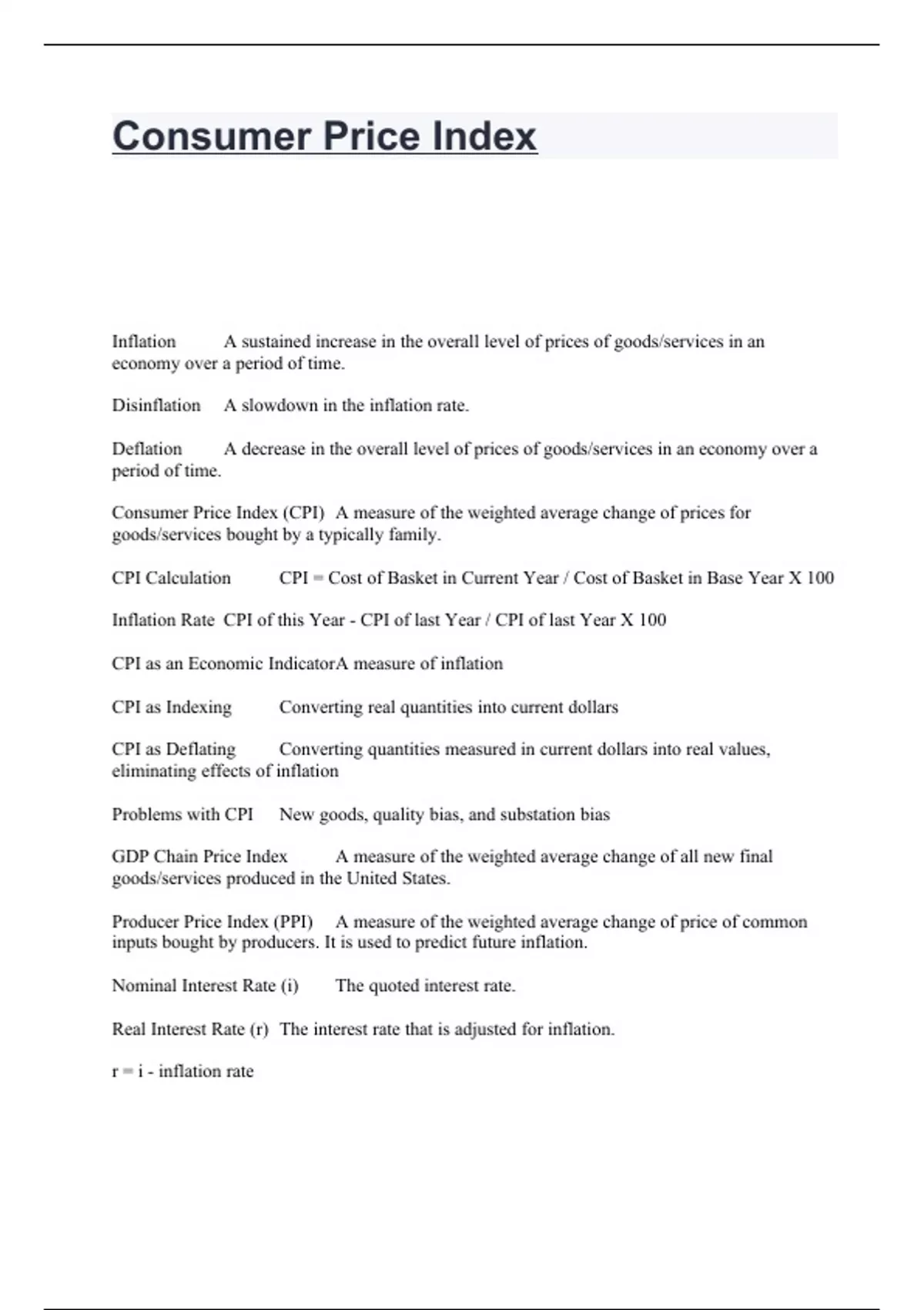 Consumer Price Index Inflation A sustained increase in the overall level of prices of goods/services in an economy over a period of time. Disinflation A slowdown in the inflation rate. Deflation A decrease in the overall level of prices of goods/services in an economy over a period of time. Consumer Price Index (CPI) A measure of the weighted average change of prices for goods/services bought by a typically family. CPI Calculation CPI = Cost of Basket in Current Year / Cost of Basket in Base Year X 100 Inflation Rate CPI of this Year - CPI of last Year / CPI of last Year X 100 CPI as an Economic Indicator A measure of inflation CPI as Indexing Converting real quantities into current dollars CPI as Deflating Converting quantities measured in current dollars into real values, eliminating effects of inflation Problems with CPI New goods, quality bias, and substation bias GDP Chain Price Index A measure of the weighted average change of all new final goods/services produced in the United States. Producer Price Index (PPI) A measure of the weighted average change of price of common inputs bought by producers. It is used to predict future inflation. Nominal Interest Rate (i) The quoted interest rate. Real Interest Rate (r) The interest