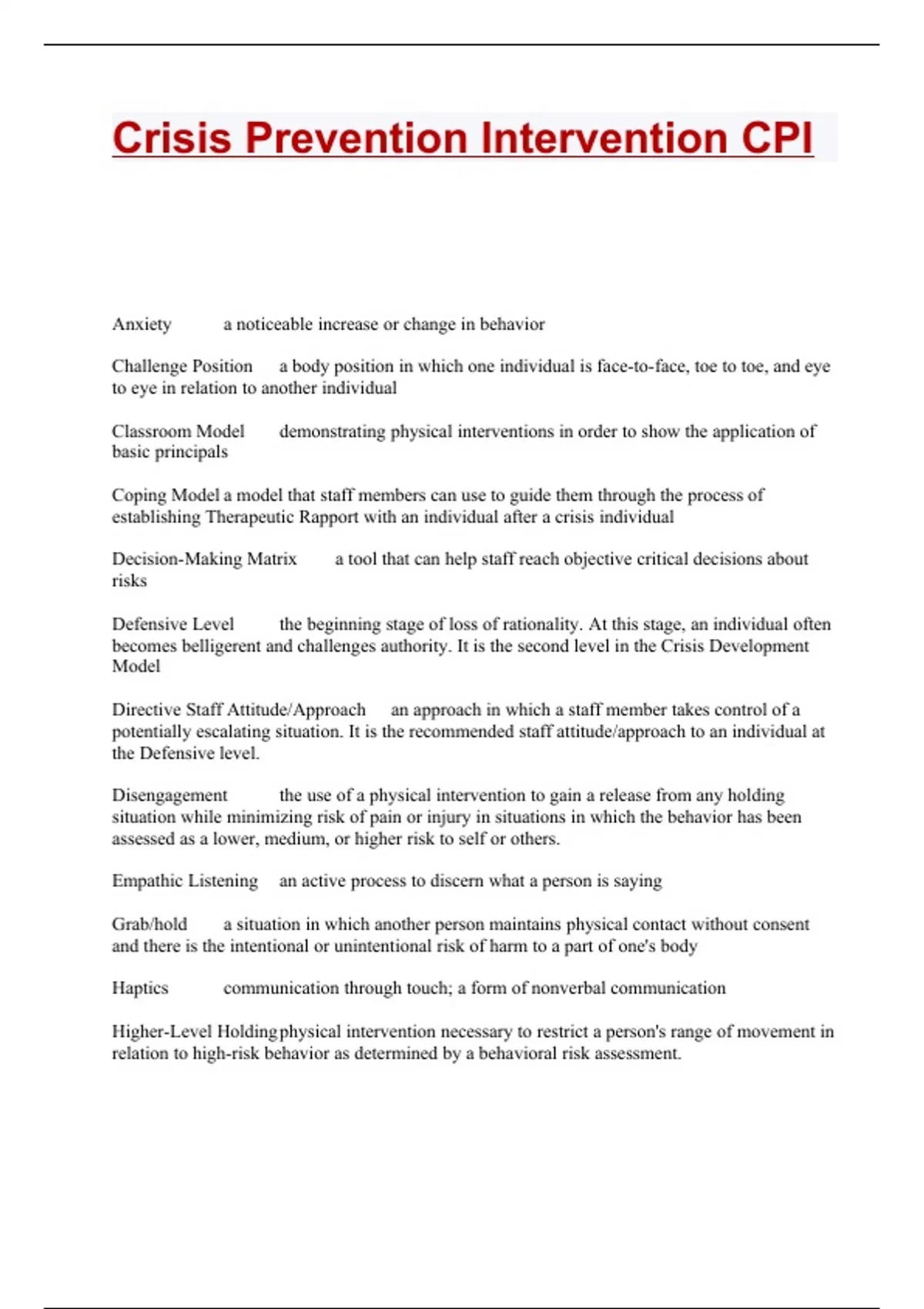 Crisis Prevention Intervention CPI Anxiety a noticeable increase or change in behavior Challenge Position a body position in which one individual is face-to-face, toe to toe, and eye to eye in relation to another individual Classroom Model demonstrating physical interventions in order to show the application of basic principals Coping Model a model that staff members can use to guide them through the process of establishing Therapeutic Rapport with an individual after a crisis individual Decision-Making Matrix a tool that can help staff reach objective critical decisions about risks Defensive Level the beginning stage of loss of rationality. At this stage, an individual often becomes belligerent and challenges authority. It is the second level in the Crisis Development Model Directive Staff Attitude/Approach an approach in which a staff member takes control of a potentially escalating situation. It is the recommended staff attitude/approach to an individual at the Defensive level. Disengagement the use of a physical intervention to gain a release from any holding situation while minimizing risk of pain or injury in situations in which the behavior has been assessed as a lower, medium, or higher risk to self or others. Empathic Listening an active process to discern what a person is saying Grab/hold a situation in which another person maintains physical contact without consent and there is the intentional or unintentional risk of harm to a part of one's body Haptics communication through touch; a form of nonverbal communication Higher-Level Holding physical intervention necessary to restrict a person's range of movement in relation to high-risk behavior as determined by a behavioral risk assessment. Integrated Experience the concept that behaviors and attitudes of staff impact behaviors and attitudes of those in their care and vice versa kinesics the nonverbal behavior that communicates messages to others via body position, posture, and movement likelihood the chance that an event or behavior may occur Limit Setting a verbal intervention skill in which a person is offered choices and consequences. Limits should be clear, simple, reasonable, and enforceable