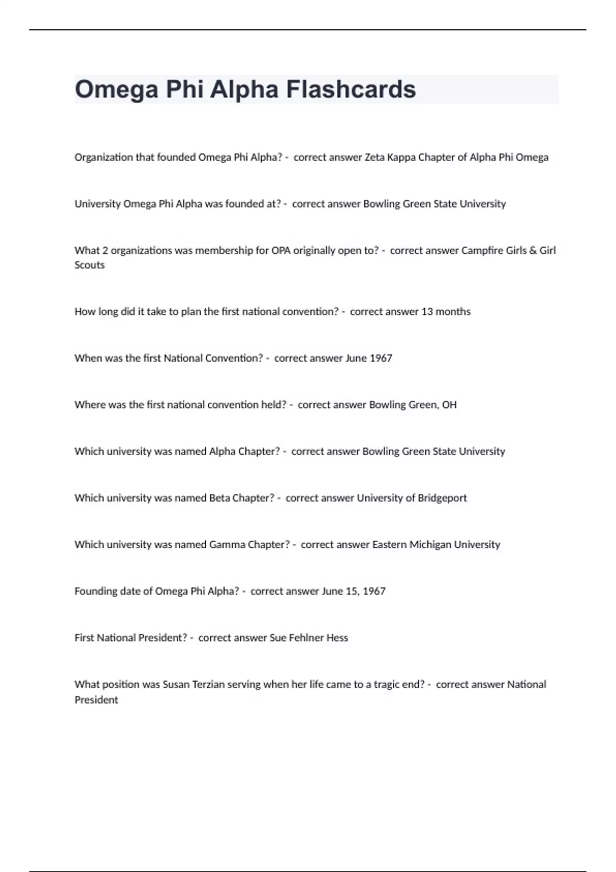 Omega Phi Alpha FlashcardsOrganization that founded Omega Phi Alpha? - correct answer Zeta Kappa Chapter of Alpha Phi Omega University Omega Phi Alpha was founded at? - correct answer Bowling Green State University What 2 organizations was membership for OPA originally open to? - correct answer Campfire Girls & Girl Scouts How long did it take to plan the first national convention? - correct answer 13 months When was the first National Convention? - correct answer June 1967 Where was the first national convention held? - correct answer Bowling Green, OH Which university was named Alpha Chapter? - correct answer Bowling Green State University Which university was named Beta Chapter? - correct answer University of Bridgeport Which university was named Gamma Chapter? - correct answer Eastern Michigan University Founding date of Omega Phi Alpha? - correct answer June 15, 1967 First National President? - correct answer Sue Fehlner Hess What position was Susan Terzian serving when her life came to a tragic end? - correct answer National President