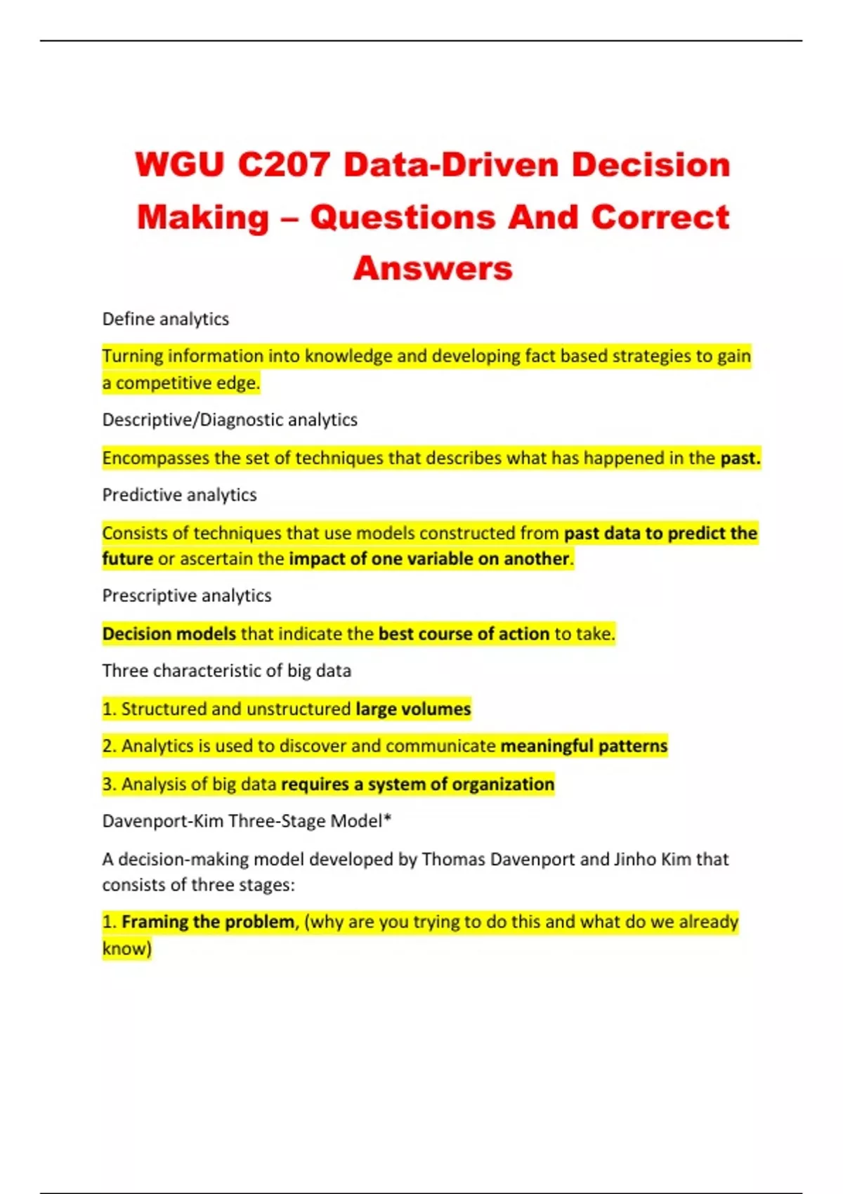 WGU C207 Data-Driven Decision Making – Questions And Correct Answers Define analytics Turning information into knowledge and developing fact based strategies to gain a competitive edge. Descriptive/Diagnostic analytics Encompasses the set of techniques that describes what has happened in the past. Predictive analytics Consists of techniques that use models constructed from past data to predict the future or ascertain the impact of one variable on another. Prescriptive analytics Decision models that indicate the best course of action to take. Three characteristic of big data 1. Structured and unstructured large volumes 2. Analytics is used to discover and communicate meaningful patterns 3. Analysis of big data requires a system of organization Davenport-Kim Three-Stage Model* A decision-making model developed by Thomas Davenport and Jinho Kim that consists of three stages: 1. Framing the problem, (why are you trying to do this and what do we already know) 2. Solving the problem (Choosing the model, collecting the data, analyzing the model) 3. Communicating results (Communicating and acting on the results) Categorical or discrete data variables Represents types of data that can be divided into groups or categories.