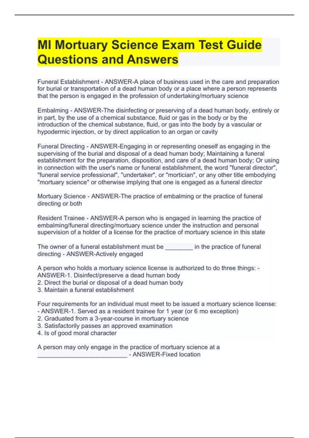 MI Mortuary Science Exam Test Guide Questions and Answers