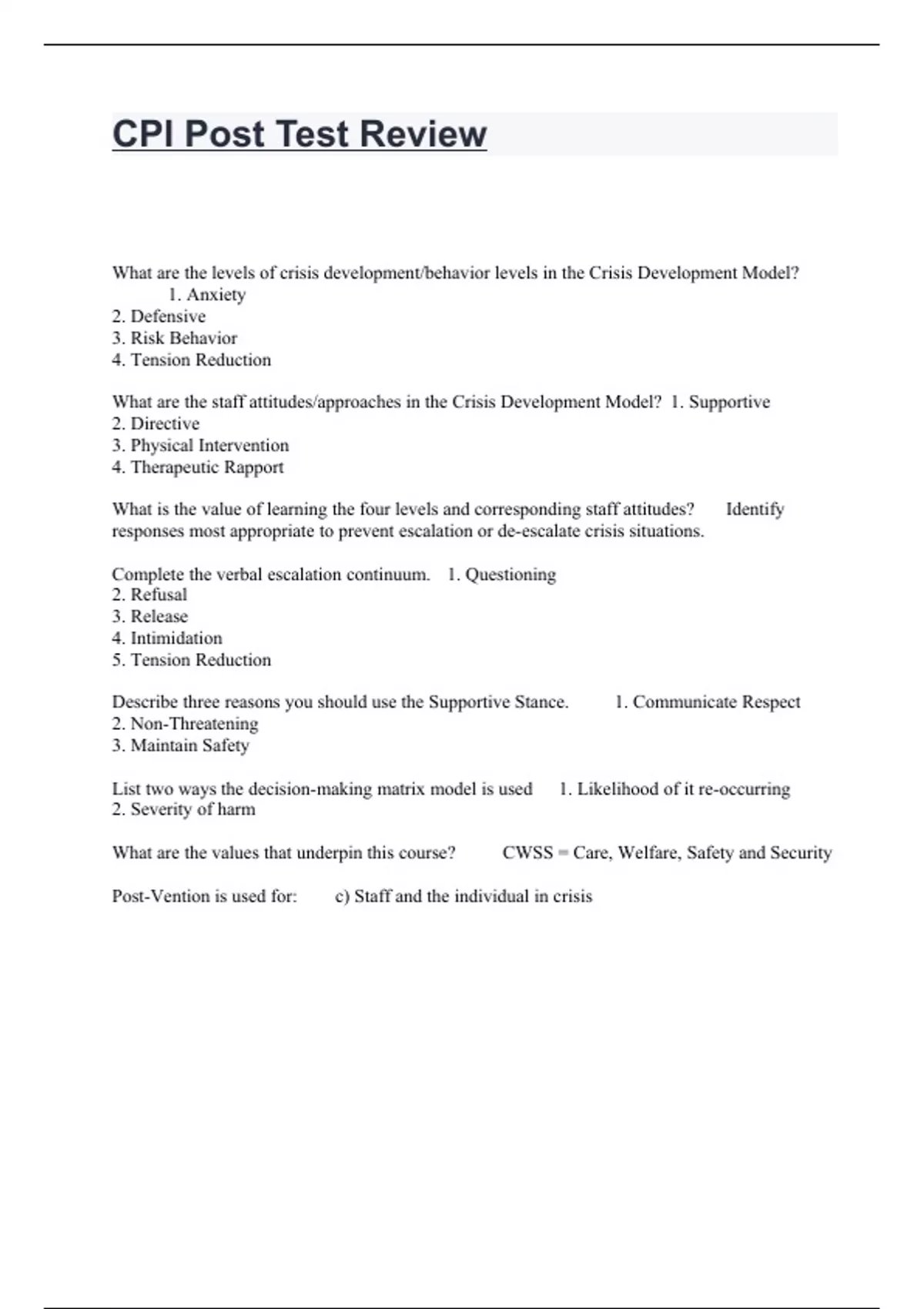 CPI Post Test Review What are the levels of crisis development/behavior levels in the Crisis Development Model? 1. Anxiety 2. Defensive 3. Risk Behavior 4. Tension Reduction What are the staff attitudes/approaches in the Crisis Development Model? 1. Supportive 2. Directive 3. Physical Intervention 4. Therapeutic Rapport What is the value of learning the four levels and corresponding staff attitudes? Identify responses most appropriate to prevent escalation or de-escalate crisis situations. Complete the verbal escalation continuum. 1. Questioning 2. Refusal 3. Release 4. Intimidation 5. Tension Reduction Describe three reasons you should use the Supportive Stance. 1. Communicate Respect 2. Non-Threatening 3. Maintain Safety List two ways the decision-making matrix model is used 1. Likelihood of it re-occurring 2. Severity of harm What are the values that underpin this course? CWSS = Care, Welfare, Safety and Security Post-Vention is used for: c) Staff and the individual in crisis