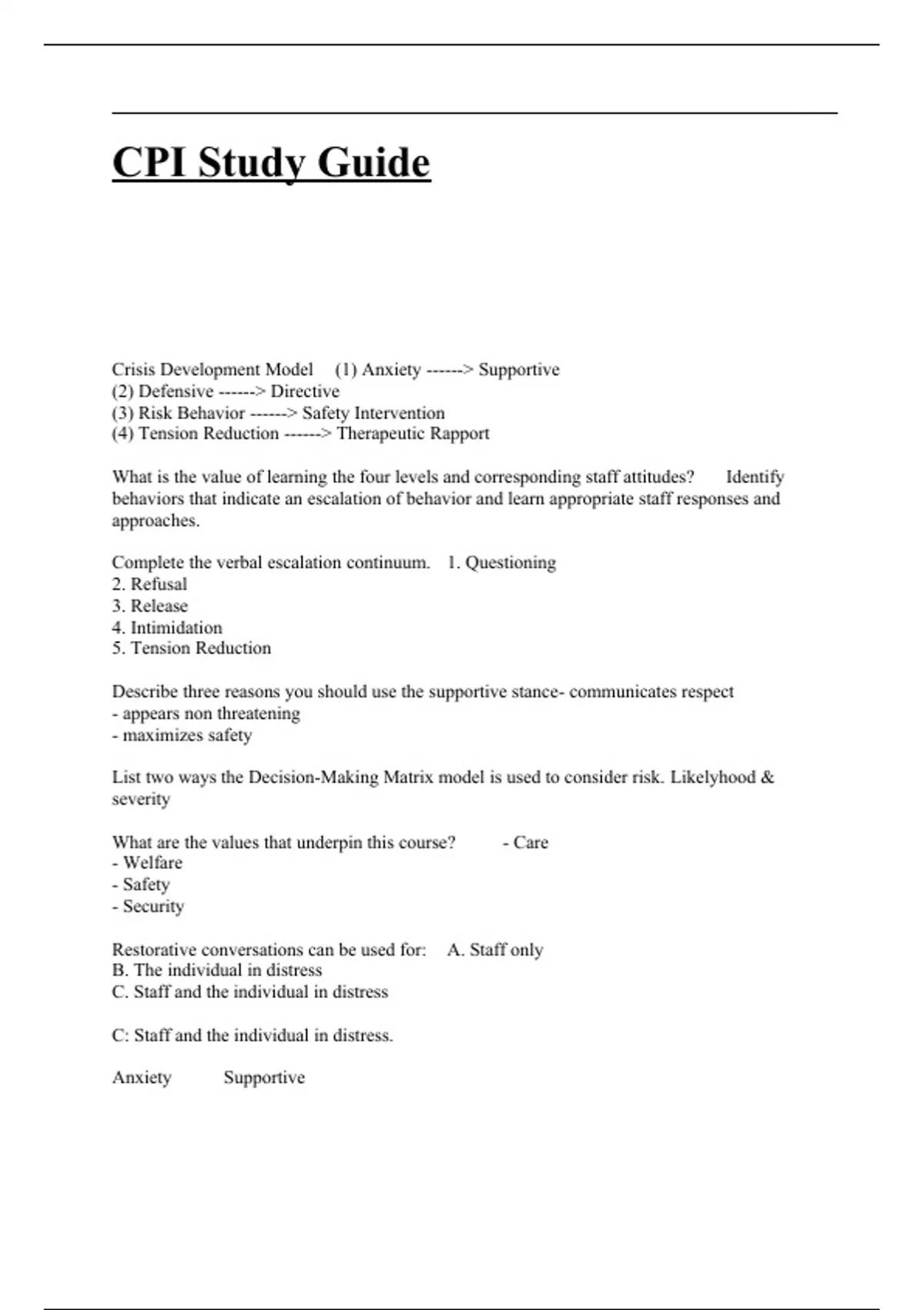 CPI Study Guide Crisis Development Model (1) Anxiety ------> Supportive (2) Defensive ------> Directive (3) Risk Behavior ------> Safety Intervention (4) Tension Reduction ------> Therapeutic Rapport What is the value of learning the four levels and corresponding staff attitudes? Identify behaviors that indicate an escalation of behavior and learn appropriate staff responses and approaches. Complete the verbal escalation continuum. 1. Questioning 2. Refusal 3. Release 4. Intimidation 5. Tension Reduction Describe three reasons you should use the supportive stance - communicates respect - appears non threatening - maximizes safety List two ways the Decision-Making Matrix model is used to consider risk. Likelyhood & severity What are the values that underpin this course? - Care - Welfare - Safety - Security Restorative conversations can be used for: A. Staff only B. The individual in distress C. Staff and the individual in distress C: Staff and the individual in distress. Anxiety Supportive Defensive Directive Risk behavior safety interventions