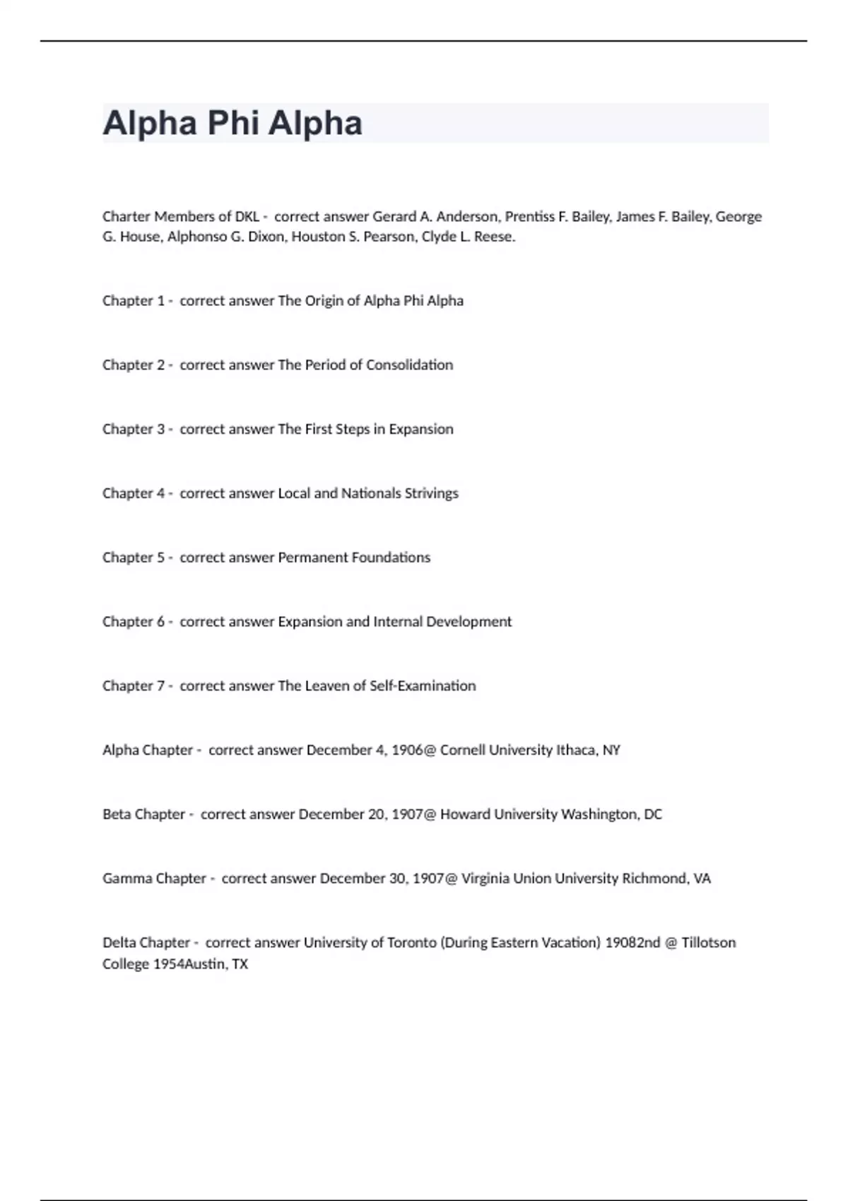 Alpha Phi AlphaCharter Members of DKL - correct answer Gerard A. Anderson, Prentiss F. Bailey, James F. Bailey, George G. House, Alphonso G. Dixon, Houston S. Pearson, Clyde L. Reese. Chapter 1 - correct answer The Origin of Alpha Phi Alpha Chapter 2 - correct answer The Period of Consolidation Chapter 3 - correct answer The First Steps in Expansion Chapter 4 - correct answer Local and Nationals Strivings Chapter 5 - correct answer Permanent Foundations Chapter 6 - correct answer Expansion and Internal Development Chapter 7 - correct answer The Leaven of Self-Examination Alpha Chapter - correct answer December 4, 1906@ Cornell University Ithaca, NY Beta Chapter - correct answer December 20, 1907@ Howard University Washington, DC Gamma Chapter - correct answer December 30, 1907@ Virginia Union University Richmond, VA Delta Chapter - correct answer University of Toronto (During Eastern Vacation) 19082nd @ Tillotson College 1954Austin, TX