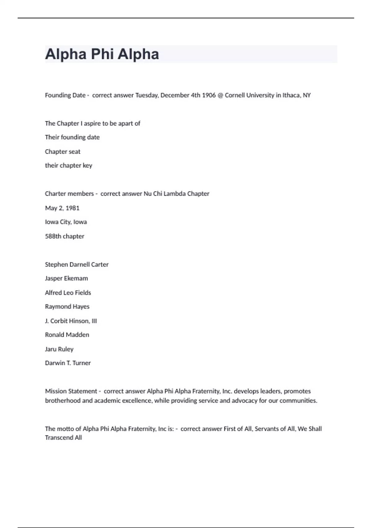 Alpha Phi Alpha Founding Date - correct answer Tuesday, December 4th 1906 @ Cornell University in Ithaca, NY The Chapter I aspire to be apart of Their founding date Chapter seat their chapter key Charter members - correct answer Nu Chi Lambda Chapter May 2, 1981 Iowa City, Iowa 588th chapter Stephen Darnell Carter Jasper Ekemam Alfred Leo Fields Raymond Hayes J. Corbit Hinson, III Ronald Madden Jaru Ruley Darwin T. Turner Mission Statement - correct answer Alpha Phi Alpha Fraternity, Inc. develops leaders, promotes brotherhood and academic excellence, while providing service and advocacy for our communities. The motto of Alpha Phi Alpha Fraternity, Inc is: - correct answer First of All, Servants of All, We Shall Transcend All