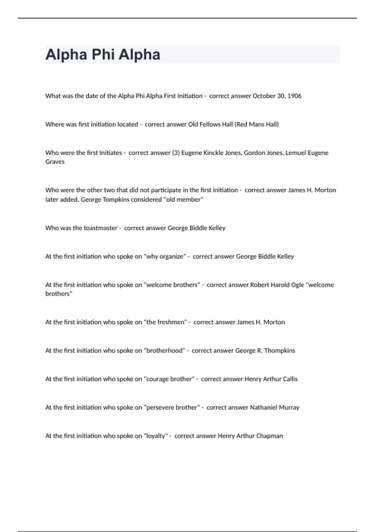 Alpha Phi AlphaWhat was the date of the Alpha Phi Alpha First Initiation - correct answer October 30, 1906 Where was first initiation located - correct answer Old Fellows Hall (Red Mans Hall) Who were the first Initiates - correct answer (3) Eugene Kinckle Jones, Gordon Jones, Lemuel Eugene Graves Who were the other two that did not participate in the first initiation - correct answer James H. Morton later added, George Tompkins considered "old member" Who was the toastmaster - correct answer George Biddle Kelley At the first initiation who spoke on "why organize" - correct answer George Biddle Kelley At the first initiation who spoke on "welcome brothers" - correct answer Robert Harold Ogle "welcome brothers" At the first initiation who spoke on "the freshmen" - correct answer James H. Morton At the first initiation who spoke on "brotherhood" - correct answer George R. Thompkins At the first initiation who spoke on "courage brother" - correct answer Henry Arthur Callis At the first initiation who spoke on "persevere brother" - correct answer Nathaniel Murray At the first initiation who spoke on "loyalty" - correct answer Henry Arthur Chapman
