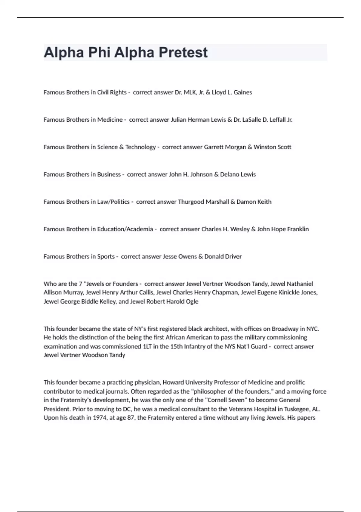Alpha Phi Alpha PretestFamous Brothers in Civil Rights - correct answer Dr. MLK, Jr. & Lloyd L. Gaines Famous Brothers in Medicine - correct answer Julian Herman Lewis & Dr. LaSalle D. Leffall Jr. Famous Brothers in Science & Technology - correct answer Garrett Morgan & Winston Scott Famous Brothers in Business - correct answer John H. Johnson & Delano Lewis Famous Brothers in Law/Politics - correct answer Thurgood Marshall & Damon Keith Famous Brothers in Education/Academia - correct answer Charles H. Wesley & John Hope Franklin Famous Brothers in Sports - correct answer Jesse Owens & Donald Driver Who are the 7 "Jewels or Founders - correct answer Jewel Vertner Woodson Tandy, Jewel Nathaniel Allison Murray, Jewel Henry Arthur Callis, Jewel Charles Henry Chapman, Jewel Eugene Kinickle Jones, Jewel George Biddle Kelley, and Jewel Robert Harold Ogle This founder became the state of NY's first registered black architect, with offices on Broadway in NYC. He holds the distinction of the being the first African American to pass the military commissioning examination and was commissioned 1LT in the 15th Infantry of the NYS Nat'l Guard - correct answer Jewel Vertner Woodson Tandy This founder became a practicing physician, Howard University Professor of Medicine and prolific contributor to medical journals. Often regarded as the "philosopher of the founders," and a moving force in the Fraternity's development, he was the only one of the "Cornell Seven" to become General President. Prior to moving to DC, he was a medical consultant to the Veterans Hospital in Tuskegee, AL. Upon his death in 1974, at age 87, the Fraternity entered a time without any living Jewels. His papers