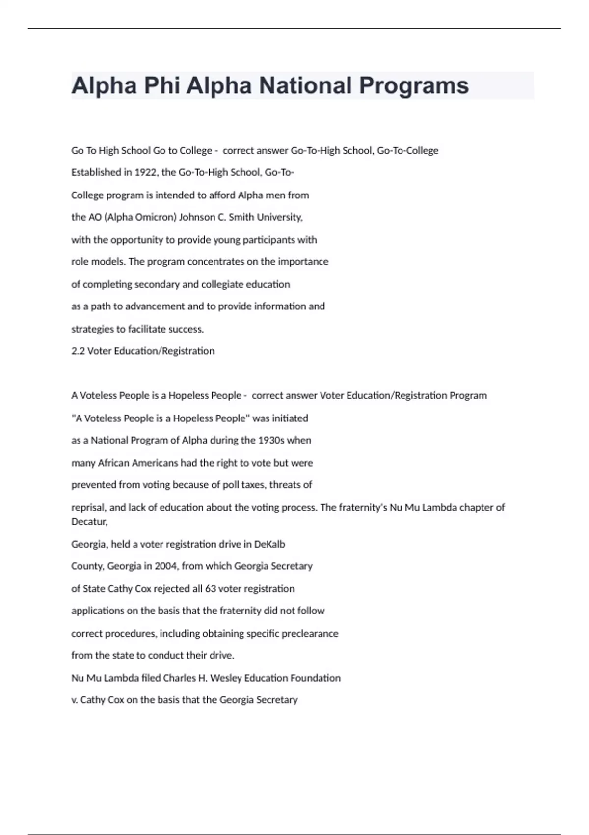 Alpha Phi Alpha National Programs Go To High School Go to College - correct answer Go-To-High School, Go-To-College Established in 1922, the Go-To-High School, Go-To- College program is intended to afford Alpha men from the ΑΟ (Alpha Omicron) Johnson C. Smith University, with the opportunity to provide young participants with role models. The program concentrates on the importance of completing secondary and collegiate education as a path to advancement and to provide information and strategies to facilitate success. 2.2 Voter Education/Registration A Voteless People is a Hopeless People - correct answer Voter Education/Registration Program "A Voteless People is a Hopeless People" was initiated as a National Program of Alpha during the 1930s when many African Americans had the right to vote but were prevented from voting because of poll taxes, threats of reprisal, and lack of education about the voting process. The fraternity's Nu Mu Lambda chapter of Decatur, Georgia, held a voter registration drive in DeKalb County, Georgia in 2004, from which Georgia Secretary of State Cathy Cox rejected all 63 voter registration applications on the basis that the fraternity did not follow correct procedures, including obtaining specific preclearance from the state to conduct their drive. Nu Mu Lambda filed Charles H. Wesley Education Foundation v. Cathy Cox on the basis that the Georgia Secretary