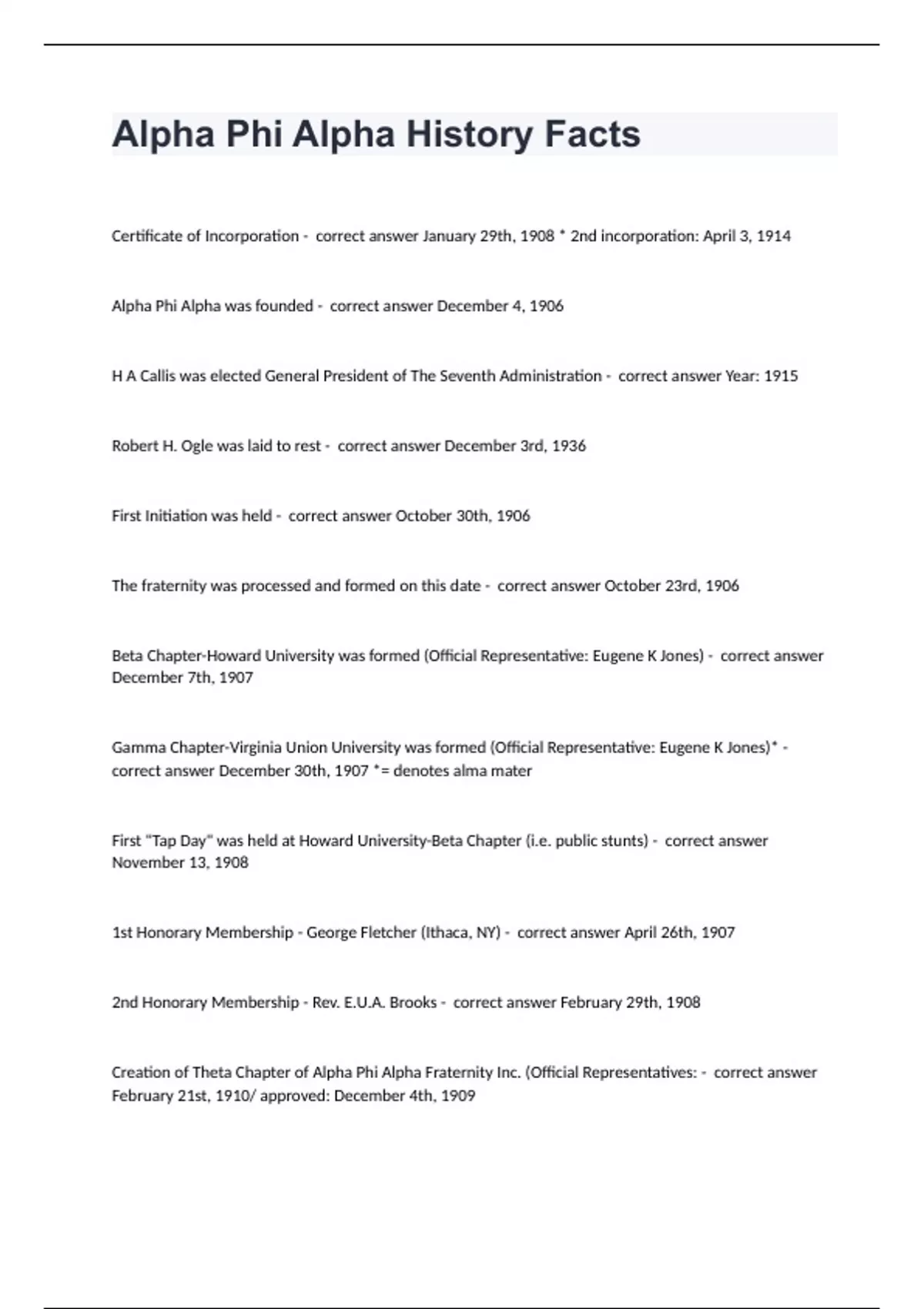 Alpha Phi Alpha History FactsCertificate of Incorporation - correct answer January 29th, 1908 * 2nd incorporation: April 3, 1914 Alpha Phi Alpha was founded - correct answer December 4, 1906 H A Callis was elected General President of The Seventh Administration - correct answer Year: 1915 Robert H. Ogle was laid to rest - correct answer December 3rd, 1936 First Initiation was held - correct answer October 30th, 1906 The fraternity was processed and formed on this date - correct answer October 23rd, 1906 Beta Chapter-Howard University was formed (Official Representative: Eugene K Jones) - correct answer December 7th, 1907 Gamma Chapter-Virginia Union University was formed (Official Representative: Eugene K Jones)* - correct answer December 30th, 1907 *= denotes alma mater First "Tap Day" was held at Howard University-Beta Chapter (i.e. public stunts) - correct answer November 13, 1908 1st Honorary Membership - George Fletcher (Ithaca, NY) - correct answer April 26th, 1907 2nd Honorary Membership - Rev. E.U.A. Brooks - correct answer February 29th, 1908 Creation of Theta Chapter of Alpha Phi Alpha Fraternity Inc. (Official Representatives: - correct answer February 21st, 1910/ approved: December 4th, 1909