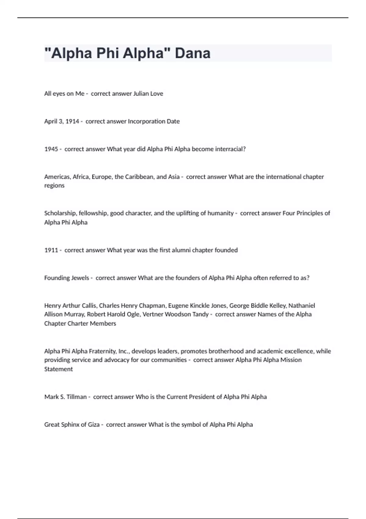 "Alpha Phi Alpha" DanaAll eyes on Me - correct answer Julian Love April 3, 1914 - correct answer Incorporation Date 1945 - correct answer What year did Alpha Phi Alpha become interracial? Americas, Africa, Europe, the Caribbean, and Asia - correct answer What are the international chapter regions Scholarship, fellowship, good character, and the uplifting of humanity - correct answer Four Principles of Alpha Phi Alpha 1911 - correct answer What year was the first alumni chapter founded Founding Jewels - correct answer What are the founders of Alpha Phi Alpha often referred to as? Henry Arthur Callis, Charles Henry Chapman, Eugene Kinckle Jones, George Biddle Kelley, Nathaniel Allison Murray, Robert Harold Ogle, Vertner Woodson Tandy - correct answer Names of the Alpha Chapter Charter Members Alpha Phi Alpha Fraternity, Inc., develops leaders, promotes brotherhood and academic excellence, while providing service and advocacy for our communities - correct answer Alpha Phi Alpha Mission Statement Mark S. Tillman - correct answer Who is the Current President of Alpha Phi Alpha Great Sphinx of Giza - correct answer What is the symbol of Alpha Phi Alpha