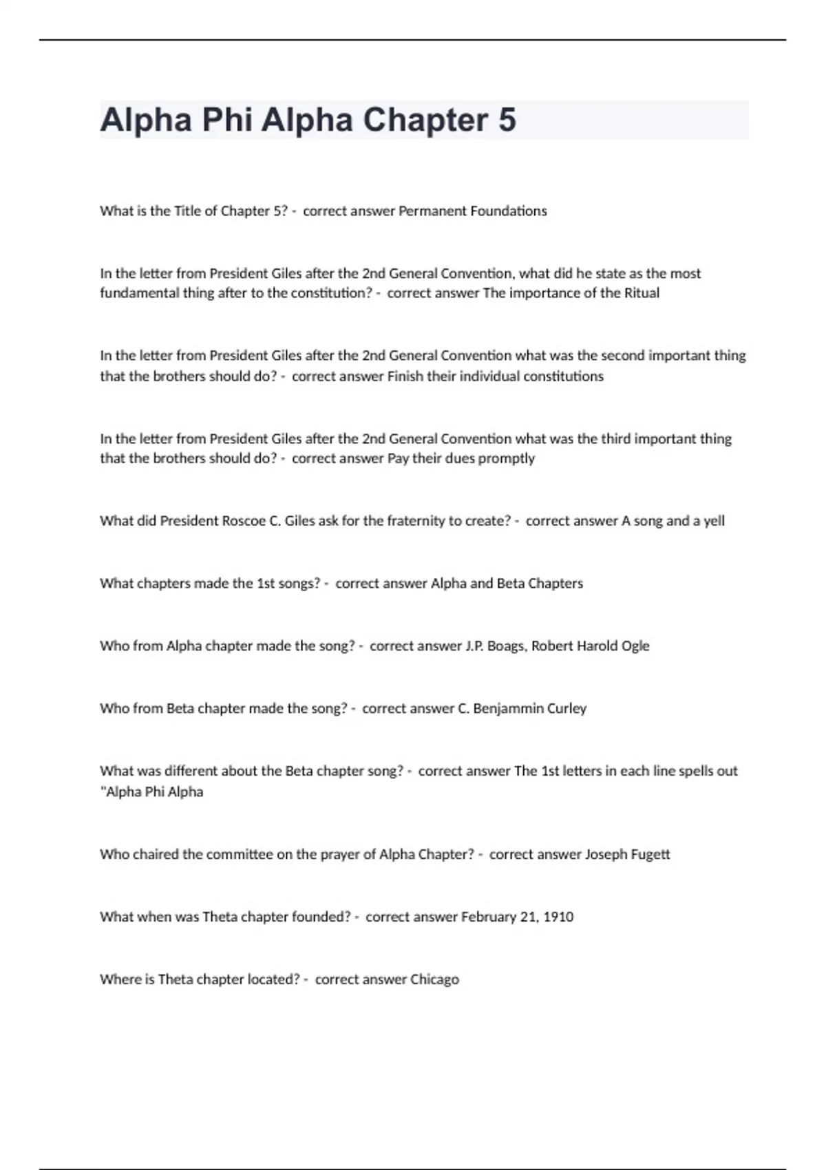 Alpha Phi Alpha Chapter 5 What is the Title of Chapter 5? - correct answer Permanent Foundations In the letter from President Giles after the 2nd General Convention, what did he state as the most fundamental thing after to the constitution? - correct answer The importance of the Ritual In the letter from President Giles after the 2nd General Convention what was the second important thing that the brothers should do? - correct answer Finish their individual constitutions In the letter from President Giles after the 2nd General Convention what was the third important thing that the brothers should do? - correct answer Pay their dues promptly What did President Roscoe C. Giles ask for the fraternity to create? - correct answer A song and a yell What chapters made the 1st songs? - correct answer Alpha and Beta Chapters Who from Alpha chapter made the song? - correct answer J.P. Boags, Robert Harold Ogle Who from Beta chapter made the song? - correct answer C. Benjammin Curley What was different about the Beta chapter song? - correct answer The 1st letters in each line spells out "Alpha Phi Alpha Who chaired the committee on the prayer of Alpha Chapter? - correct answer Joseph Fugett What when was Theta chapter founded? - correct answer February 21, 1910 Where is Theta chapter located? - correct answer Chicago