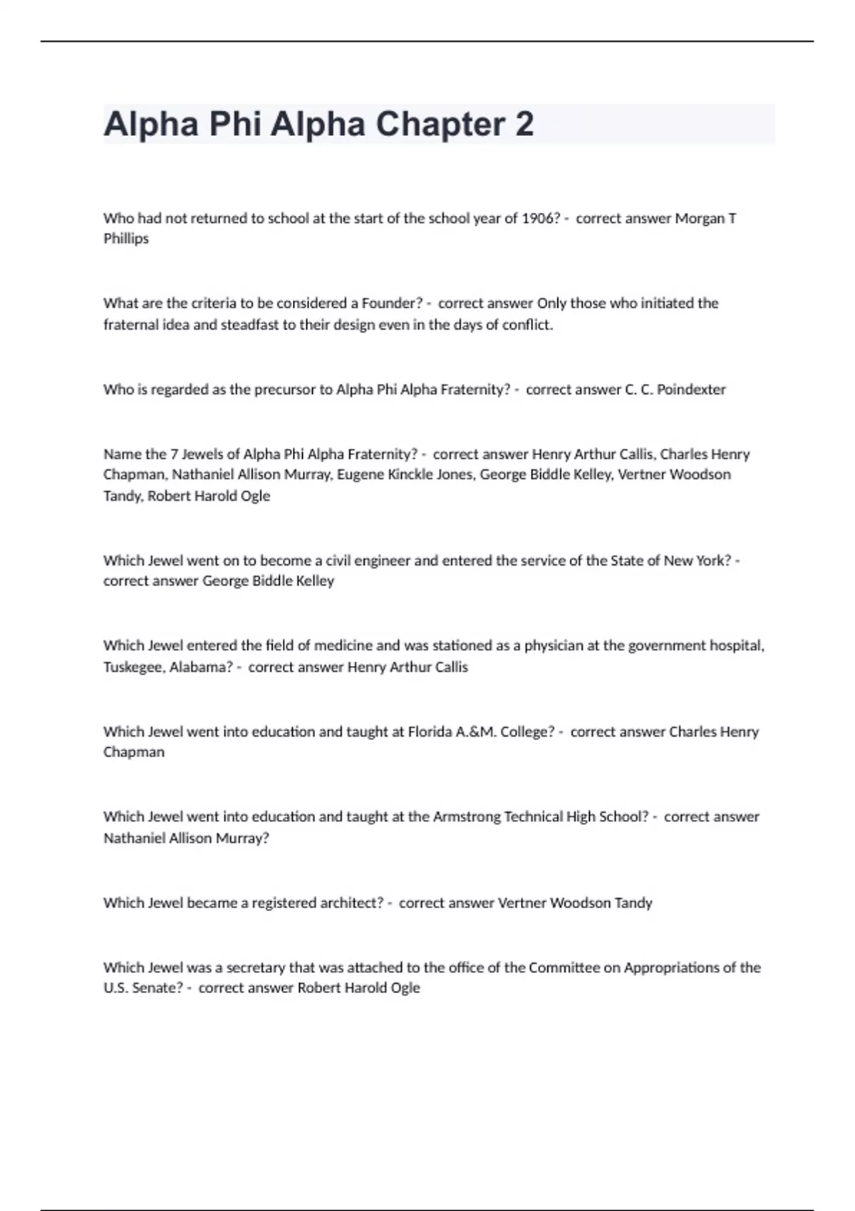 Alpha Phi Alpha Chapter 2 Who had not returned to school at the start of the school year of 1906? - correct answer Morgan T Phillips What are the criteria to be considered a Founder? - correct answer Only those who initiated the fraternal idea and steadfast to their design even in the days of conflict. Who is regarded as the precursor to Alpha Phi Alpha Fraternity? - correct answer C. C. Poindexter Name the 7 Jewels of Alpha Phi Alpha Fraternity? - correct answer Henry Arthur Callis, Charles Henry Chapman, Nathaniel Allison Murray, Eugene Kinckle Jones, George Biddle Kelley, Vertner Woodson Tandy, Robert Harold Ogle Which Jewel went on to become a civil engineer and entered the service of the State of New York? - correct answer George Biddle Kelley Which Jewel entered the field of medicine and was stationed as a physician at the government hospital, Tuskegee, Alabama? - correct answer Henry Arthur Callis Which Jewel went into education and taught at Florida A.&M. College? - correct answer Charles Henry Chapman Which Jewel went into education and taught at the Armstrong Technical High School? - correct answer Nathaniel Allison Murray? Which Jewel became a registered architect? - correct answer Vertner Woodson Tandy Which Jewel was a secretary that was attached to the office of the Committee on Appropriations of the U.S. Senate? - correct answer Robert Harold Ogle