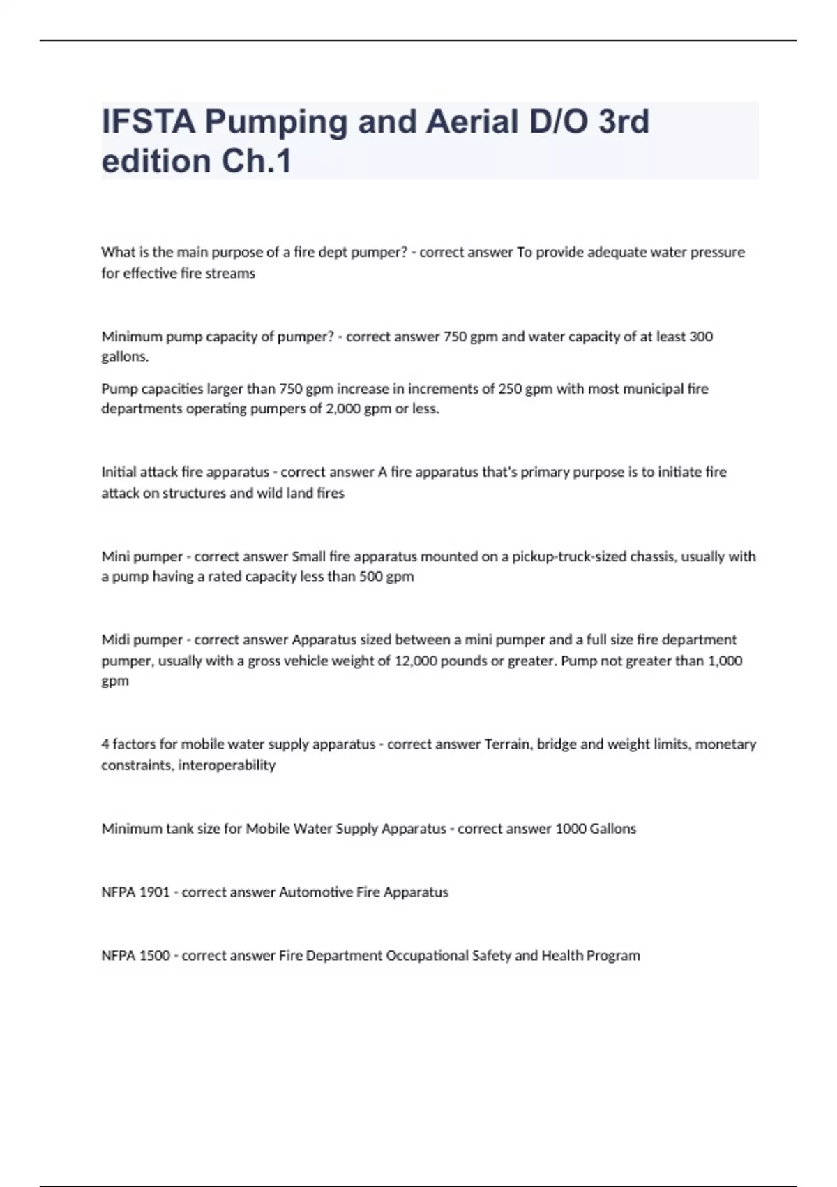 IFSTA Pumping and Aerial D/O 3rd edition Ch.1What is the main purpose of a fire dept pumper? - correct answer To provide adequate water pressure for effective fire streams Minimum pump capacity of pumper? - correct answer 750 gpm and water capacity of at least 300 gallons. Pump capacities larger than 750 gpm increase in increments of 250 gpm with most municipal fire departments operating pumpers of 2,000 gpm or less. Initial attack fire apparatus - correct answer A fire apparatus that's primary purpose is to initiate fire attack on structures and wild land fires Mini pumper - correct answer Small fire apparatus mounted on a pickup-truck-sized chassis, usually with a pump having a rated capacity less than 500 gpm Midi pumper - correct answer Apparatus sized between a mini pumper and a full size fire department pumper, usually with a gross vehicle weight of 12,000 pounds or greater. Pump not greater than 1,000 gpm 4 factors for mobile water supply apparatus - correct answer Terrain, bridge and weight limits, monetary constraints, interoperability Minimum tank size for Mobile Water Supply Apparatus - correct answer 1000 Gallons NFPA 1901 - correct answer Automotive Fire Apparatus NFPA 1500 - correct answer Fire Department Occupational Safety and Health Program
