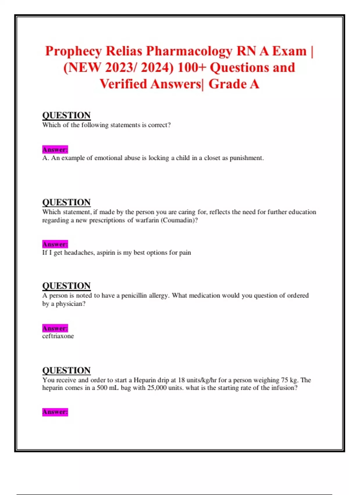 Prophecy Relias Pharmacology RN A Exam 2024 - 100+ Questions and Verified Answers| Grade QUESTION Which of the following statements is correct? Answer: A. An example of emotional abuse is locking a child in a closet as punishment. QUESTION Which statement, if made by the person you are caring for, reflects the need for further education regarding a new prescriptions of warfarin (Coumadin)? Answer: If I get headaches, aspirin is my best options for pain QUESTION A person is noted to have a penicillin allergy. What medication would you question of ordered by a physician? Answer: ceftriaxone QUESTION You receive and order to start a Heparin drip at 18 units/kg/hr for a person weighing 75 kg. The heparin comes in a 500 mL bag with 25,000 units. what is the starting rate of the infusion? Answer: 27 mL/hr QUESTION The physician orders 0.5 mg/kg of a medications. The medication is supplied in a 10 mg/mL solution. The person you are caring for weighs 40 kg. How many mL of the drug would you administer?f Answer: 2 mL QUESTION A person with a hypothyroidism has a serum calcium level of 13 mg/dL. What medication would you expect to administer? Answer: Calcitonin QUESTION A person you are caring for has a known GI bleed. What drug is contraindicated? Answer: enoxaparin (Lovenox) QUESTION A person has been prescribed nitrofurantoin (Furadantin) for a UTI. What education would you provide for them? Answer: wash your mouth out after taking this medication to avoid staining of the teeth QUESTION............