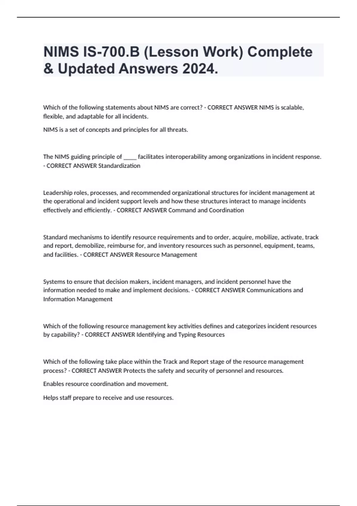 NIMS IS-700.B (Lesson Work) Complete & Updated Answers 2024. Which of the following statements about NIMS are correct? - CORRECT ANSWER NIMS is scalable, flexible, and adaptable for all incidents. NIMS is a set of concepts and principles for all threats. The NIMS guiding principle of ____ facilitates interoperability among organizations in incident response. - CORRECT ANSWER Standardization Leadership roles, processes, and recommended organizational structures for incident management at the operational and incident support levels and how these structures interact to manage incidents effectively and efficiently. - CORRECT ANSWER Command and Coordination Standard mechanisms to identify resource requirements and to order, acquire, mobilize, activate, track and report, demobilize, reimburse for, and inventory resources such as personnel, equipment, teams, and facilities. - CORRECT ANSWER Resource Management Systems to ensure that decision makers, incident managers, and incident personnel have the information needed to make and implement decisions. - CORRECT ANSWER Communications and Information Management Which of the following resource management key activities defines and categorizes incident resources by capability? - CORRECT ANSWER Identifying and Typing Resources Which of the following take place within the Track and Report stage of the resource management process? - CORRECT ANSWER Protects the safety and security of personnel and resources. Enables resource coordination and movement. Helps staff prepare to receive and use resources.